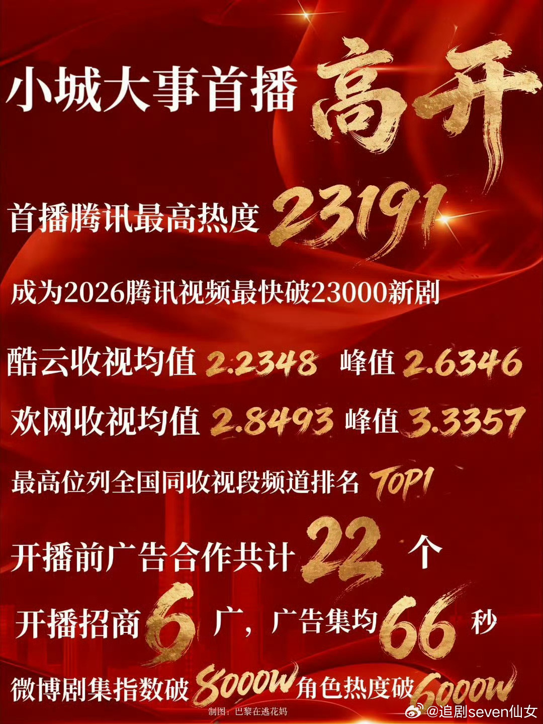 小城大事开播前目前已经超过昨日热度峰值,走势很好,上星收视率也很高,首日台网高开。小城大事追的很爽,好饭不怕晚,现在影视寒冬,不能跟之前的长剧市场比,接下来播剧的一个个就会老实,别打时间差尬嘲小城大事。作为年代剧高开并走势非常稳,赵丽颖黄晓明等等所有演员演技适配度剧情逻辑都是top,剧情也很有意思,还会时不时笑出声,处处洋溢着黄金上升期的喜感,小城大事很好看,品质内容都很好,期待后续的情节发展,李镇长要上任了。小城大事 赵丽颖台词