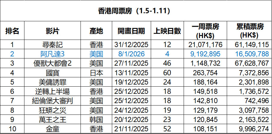 2026年第2周香港票房 :1.《寻秦记》蝉联冠军,累计票房6114万排名香港影史第51,1月17日起上映4DX版;2.《阿凡达3》开画不敌《寻秦记》;3.《疯狂动物城2》累计票房6762万排名香港影史第37。(数据:香港贸发局)