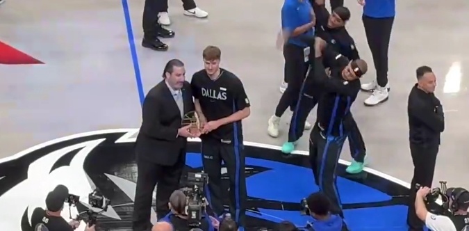 独行侠主场对阵掘金。赛前,弗拉格领取了12月西部最佳新秀的奖杯。