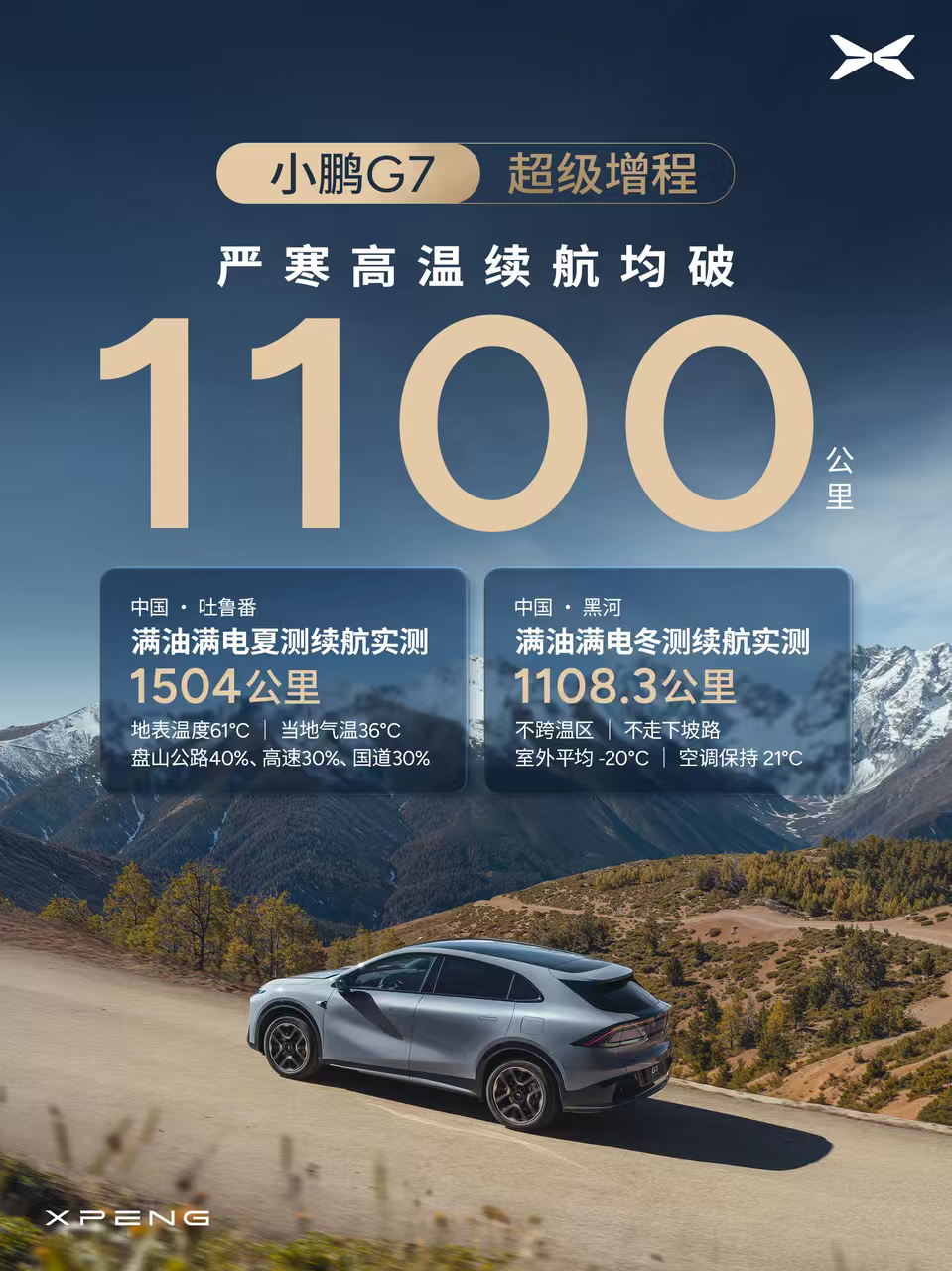 小鹏G7极寒极热续航实测均1100公里 小鹏G7超级增程展现全气候硬核实力,纵贯南北极端温差,续航表现始终卓越。在零下20℃的黑河冬季测试中,续航突破1100公里;在吐鲁番夏季高温环境中,更做到了1504公里的超长续航。跨越近100℃的极寒与极热的考验,小鹏G7超级增程夏测、冬测续航双双突破1100公里,以扎实性能终结所有里程焦虑。