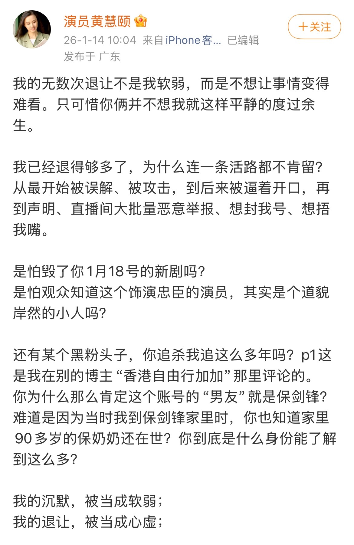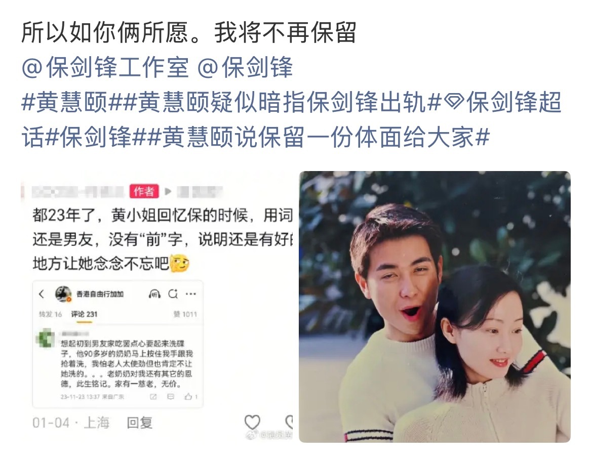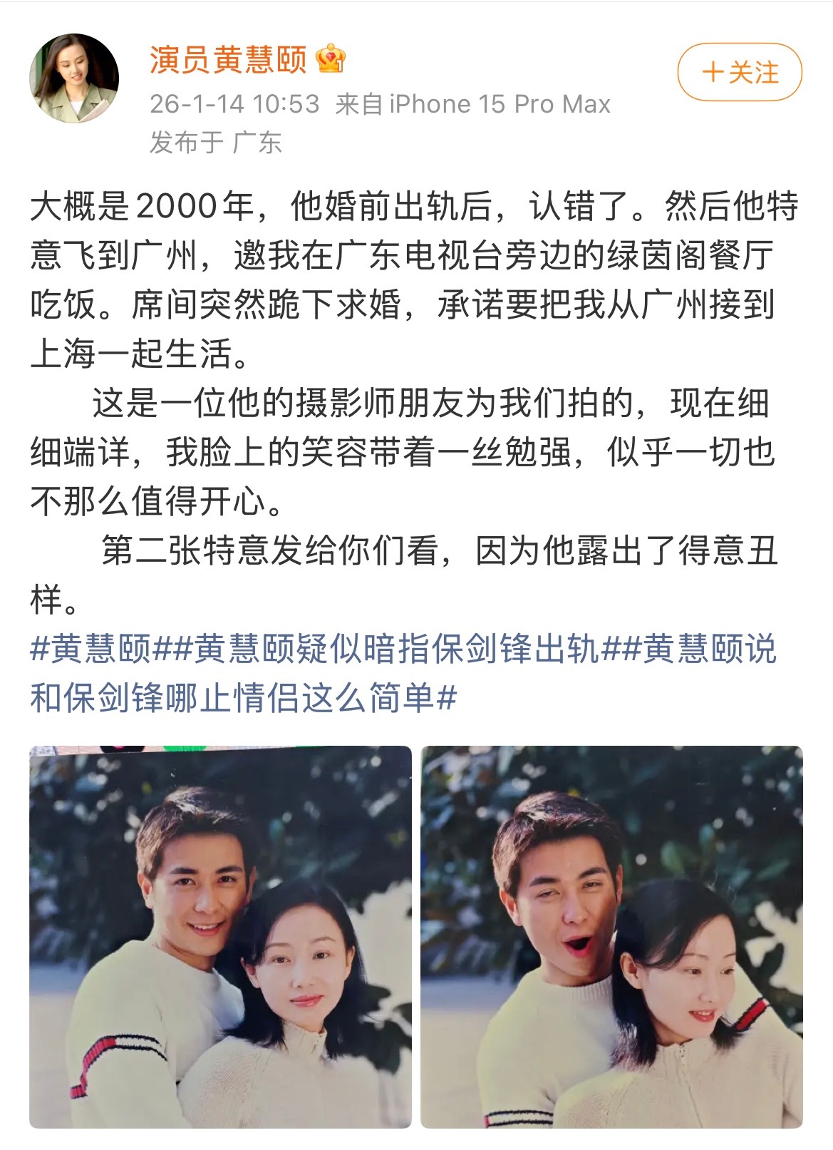 黄慧颐说保剑锋婚前出轨2026年1月14日,演员黄慧颐在社交平台发文并晒旧照,直指保剑锋在2000年左右婚前出轨,被她抓包后曾飞至广州,在广东电视台旁的绿茵阁餐厅下跪求婚并承诺婚后将其接到上海生活,还称对方如今不让她“活路”。2025年12月初,黄慧颐直播称与保剑锋1997-2007年相恋,保剑锋2006年拍摄《小城往事》时与现任妻子何珈好有感情重叠期,存在出轨,还提及香水被转赠等事。12月12日,保剑锋工作室发声明否认“感情重叠期”“出轨”“香水转赠”等指控。12月26日,工作室发布律师声明,称已取证起诉相关造谣者,否认所有指控。2026年1月14日,黄慧颐再次发声并晒照,详述2000年保剑锋出轨、下跪求婚等细节。事情过去小二十年了,不管当初保剑锋做没做错,都这么久了,还有什么恩怨揪着不放啊?全都是五十多岁的人了!不管我发现保剑锋好像比较喜欢姐姐。保剑锋,1975年11月,50岁。前女友黄慧颐,1968年1月,57岁。妻子何珈好,1969年2月,56岁。