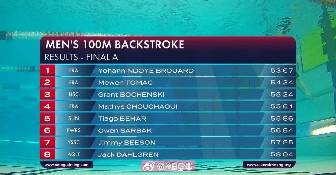 美国游泳系列赛奥斯丁站 男100仰决赛Yohann Ndoye-Brouard 53.67