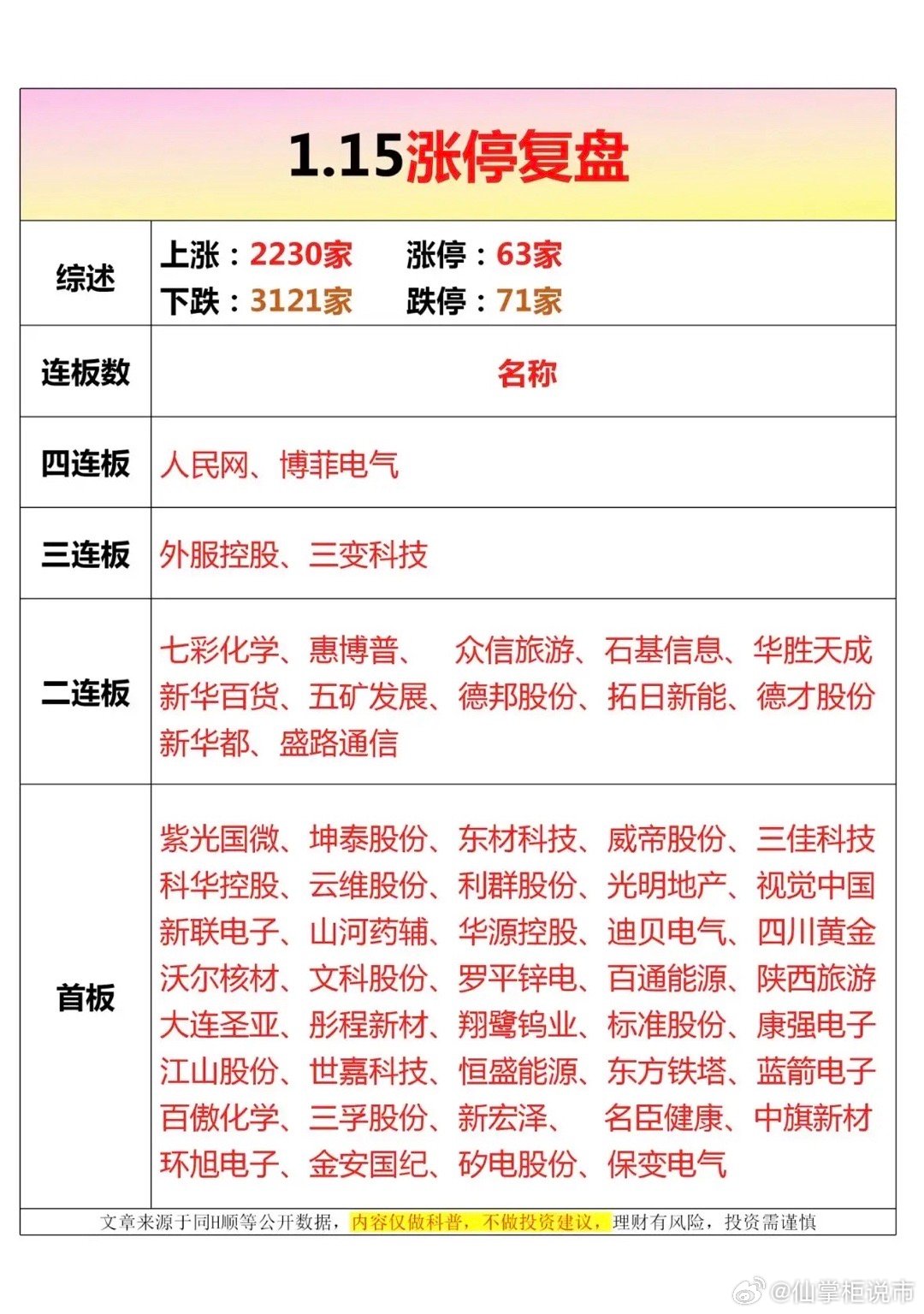 1.15涨停复盘:2230家上涨,63家涨停,投资机会大!A股震荡分化:连板股活跃但普跌明显,旅游科技领涨,市场情绪谨慎需理性投资