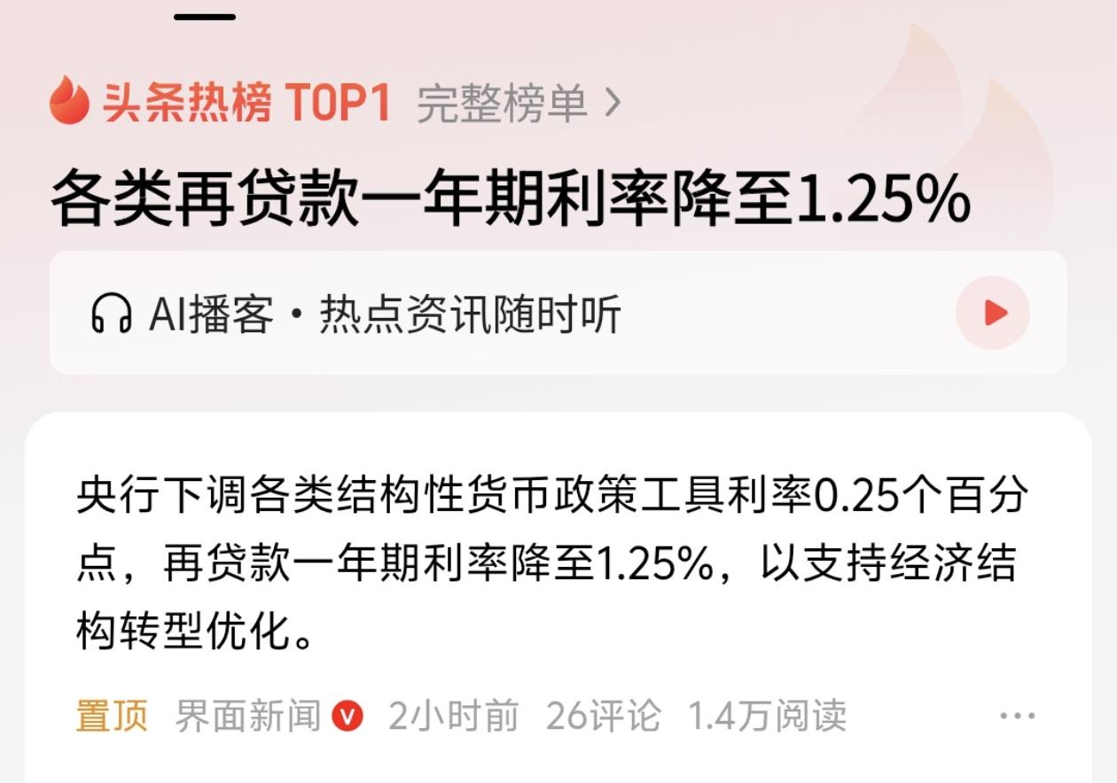 今日(1月15日),央行宣布下调各类结构性货币政策工具利率0.25个百分点,一年期再贷款利率由1.5%降至1.25%。这不仅是继2025年5月后的再次“降息”,更是向市场释放了明确的政策转向信号。 此次降息并非“大水漫灌”,而是典型的“精准滴灌”。通过降低银行资金成本,激励金融机构将更多信贷资源投向小微企业、科技创新、绿色转型等重点领域。这直接降低了实体经济的融资成本,尤其是为中小民营企业带来了实质性的减负利好。 央行同步推出了增加支农支小再贷款额度、单设1万亿元民营企业再贷款、扩大科技贷款支持范围等“组合拳”。这表明2026年的货币政策思路已发生转变:从单纯的数量投放转向“价量并举”,更注重存量政策与增量政策的集成效应。 此外,央行首次提出将“物价合理回升”作为重要考量,暗示后续可能有更多宽松政策储备。在全球经济动能不足的背景下,这一系列举措旨在稳住经济大盘,提振市场信心,为高质量发展提供坚实的金融支撑。