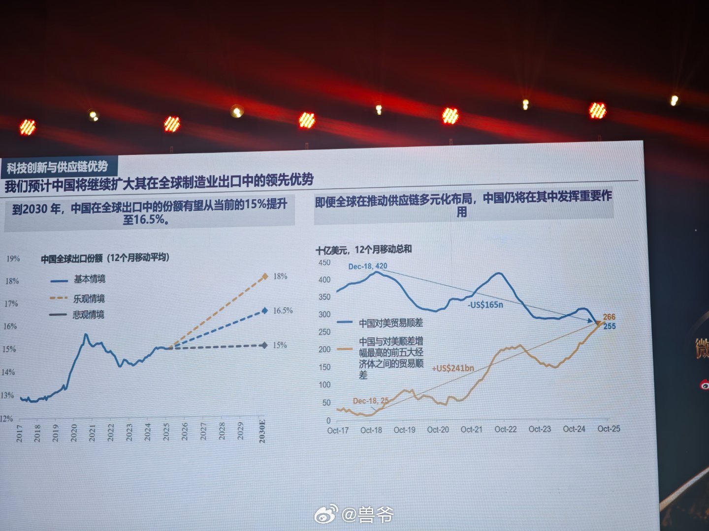 微博财经之夜。大摩邢自强预测,中国将继续扩大其在全球制造业出口中的领先优势,到2030年,中国在全球出口中的份额有望从当前的15%提升至16.5%