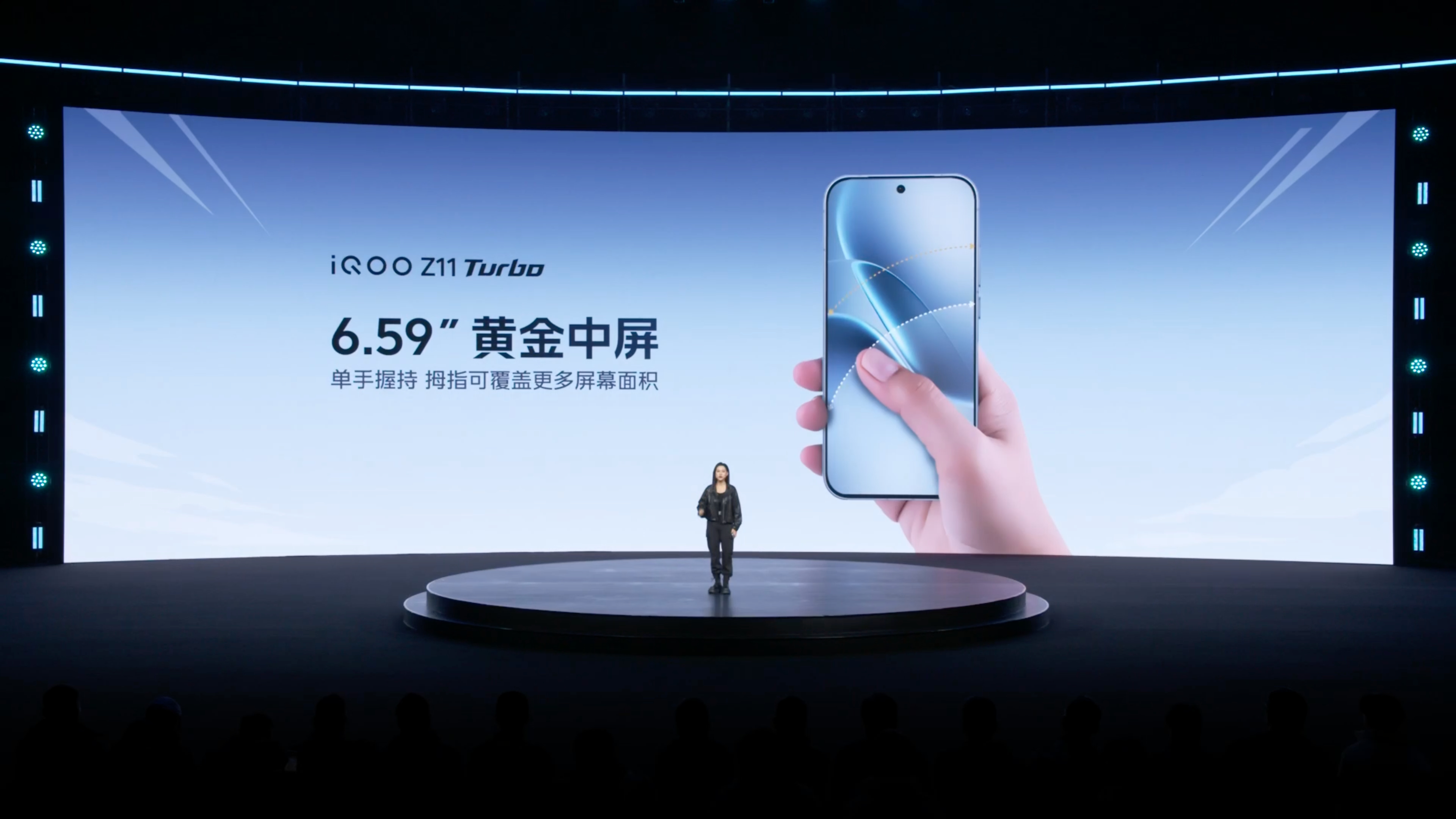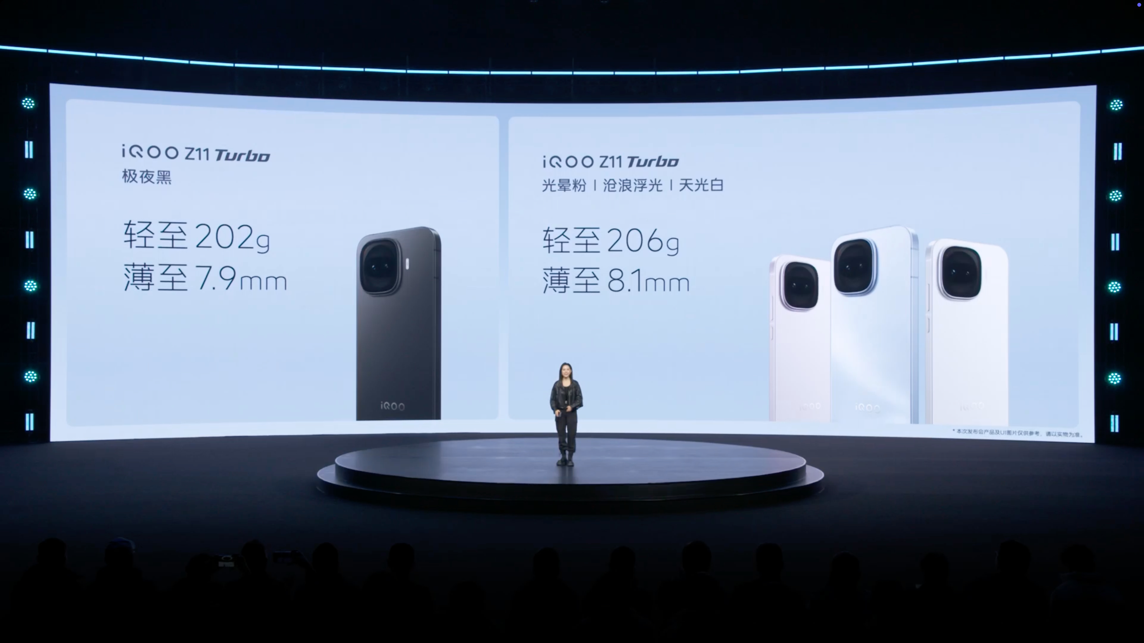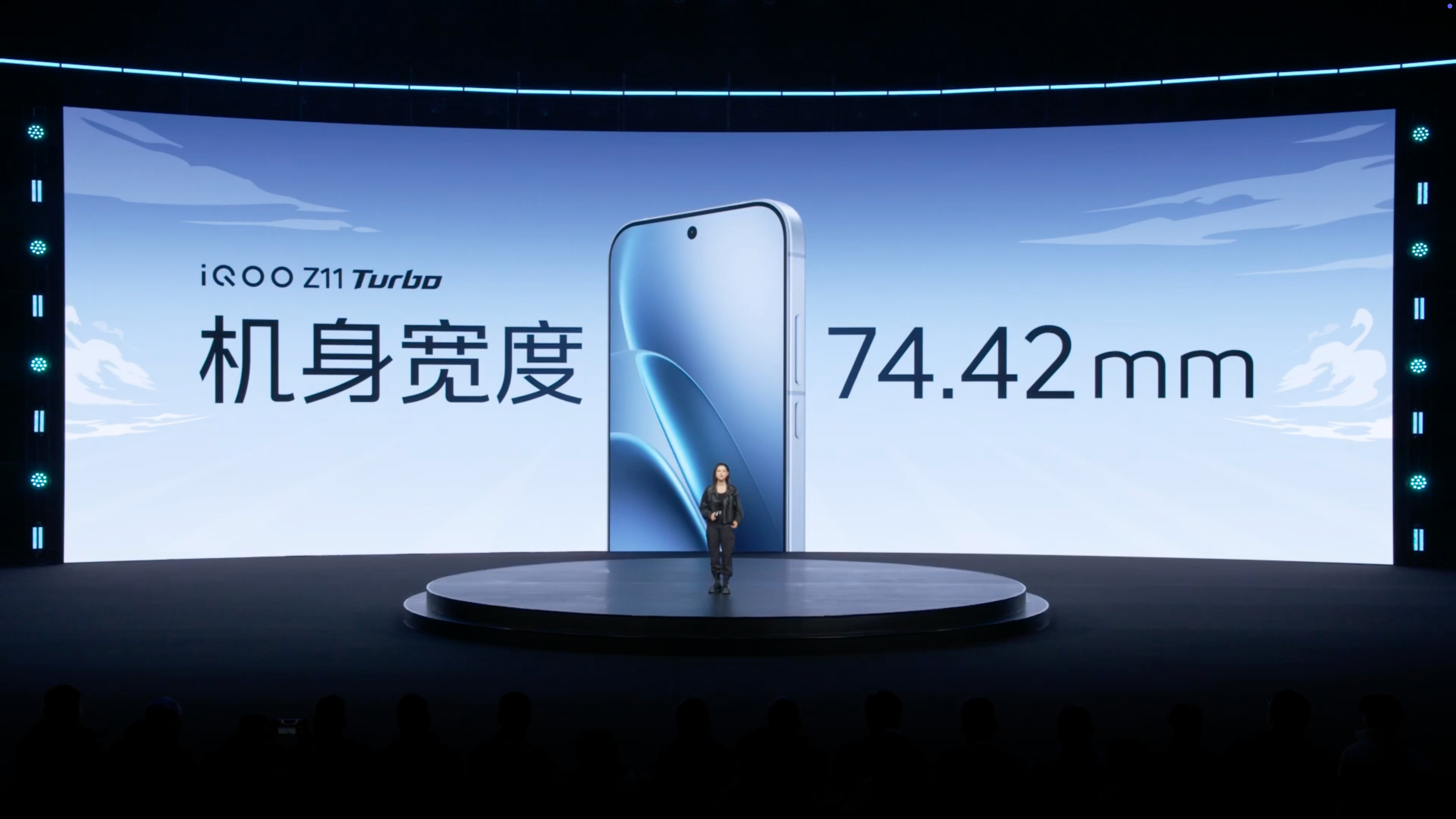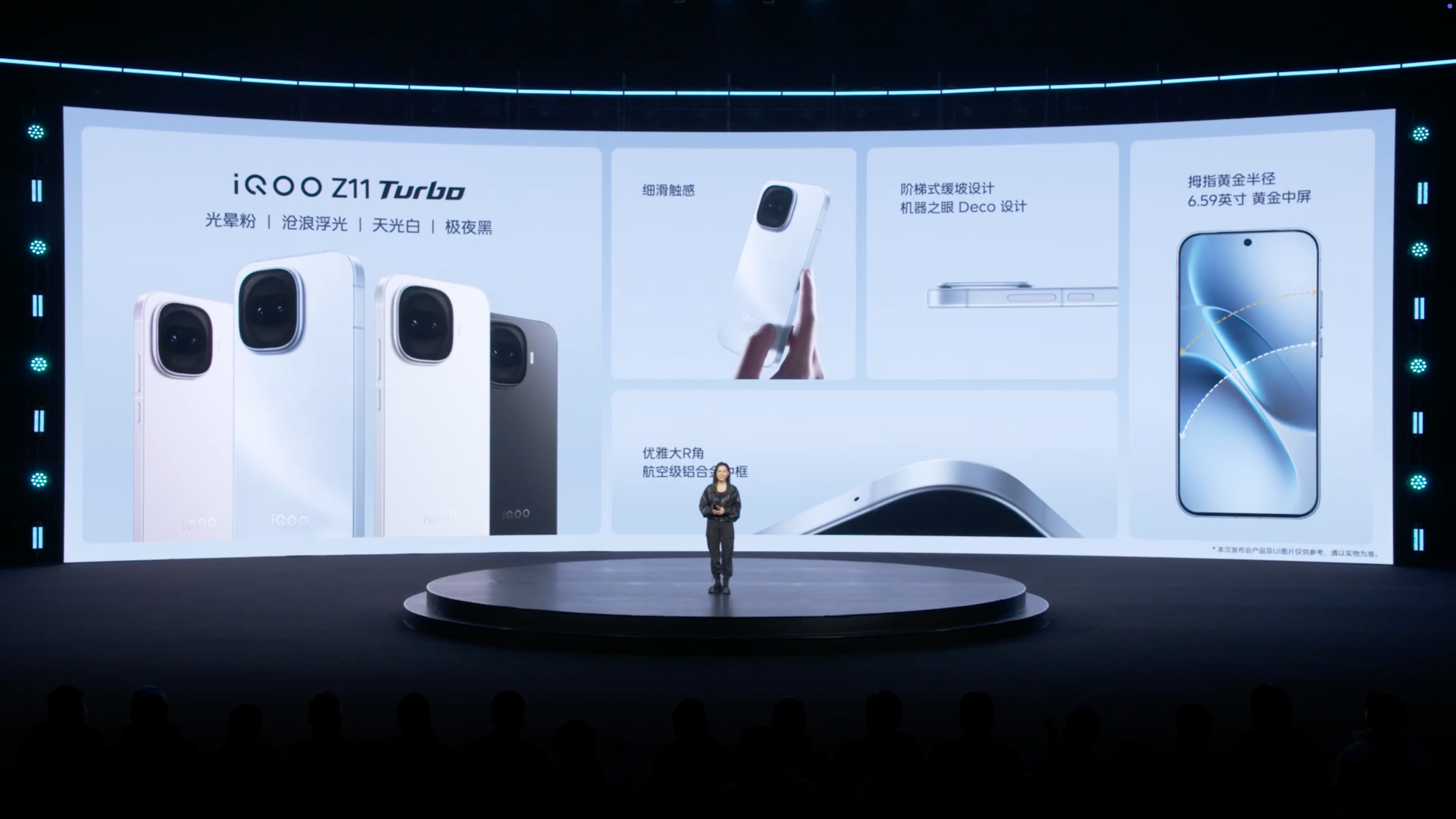 iQOO Z11 Turbo 搭载 6.59 英寸黄金中屏,机身宽度仅 74.42mm,大 R 角设计。黑白蓝粉共四种配色,对应命名极夜黑、天光白、沧浪浮光、光晕粉。为了实现中屏的大小,iQOO Z11 Turbo 搭载核舟架构,机身厚度仅 7.9mm、重量 202g。搭载折叠屏同款超薄扬声器,第四代硅负极技术轻薄电池、超高能量密度。