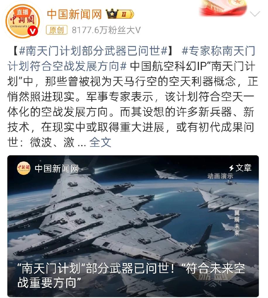 南天门计划照进现实!这些武器已列装…… 中国新闻网消息刷屏!曾被视作科幻的“南天门计划”,正悄然落地。 军事专家称其契合空天一体化空战方向,多款利器已有现实成果: 激光、微波定向能武器列装部队,鹰击系列高超音速导弹公开亮相,变循环发动机技术持续突破。 从“鸾鸟”平台构想到“玄女”战机技术探索,这不是空想,是国防科技的硬核前瞻! 军事