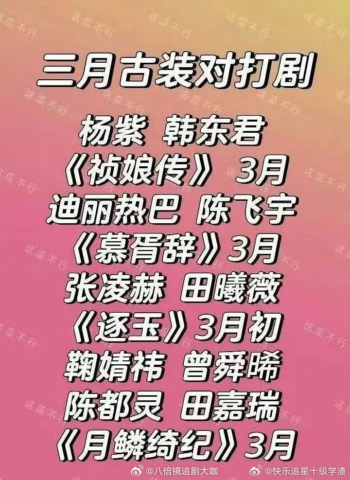 3月份对打的古装剧哇塞了啊,这是闷声干大事啊!没想到三月份对打的古装剧这么多啊,除了杨紫、迪丽热巴。连鞠婧祎、张凌赫、田曦薇的新剧也万在3月播出,不得不说,已经感受到俊男美女会卖力剧宣了,坐等新剧定档官宣啊!祯娘传慕胥辞逐玉月鳞绮纪均在3月播出