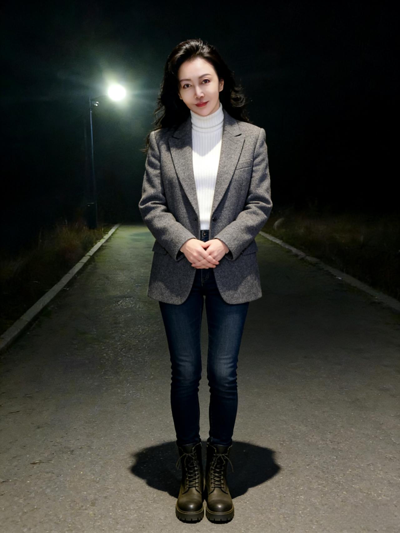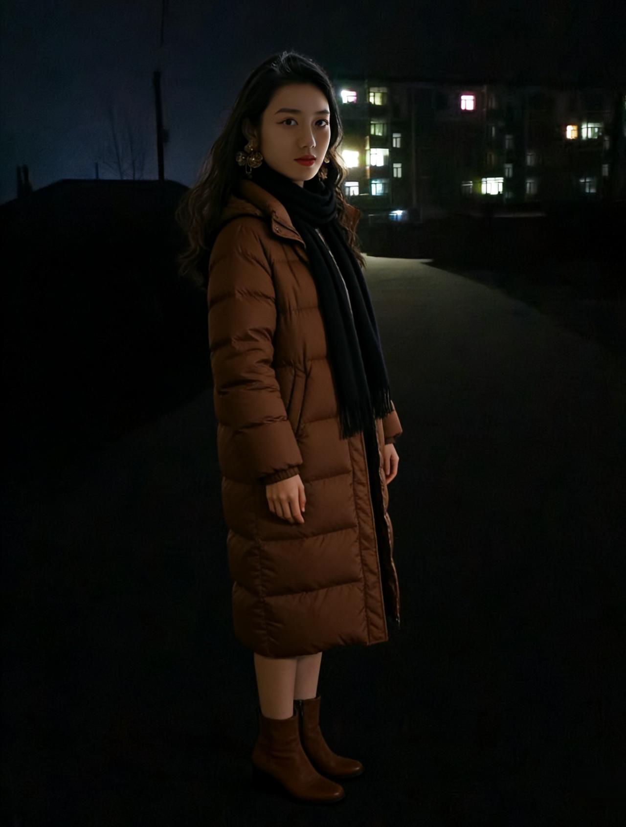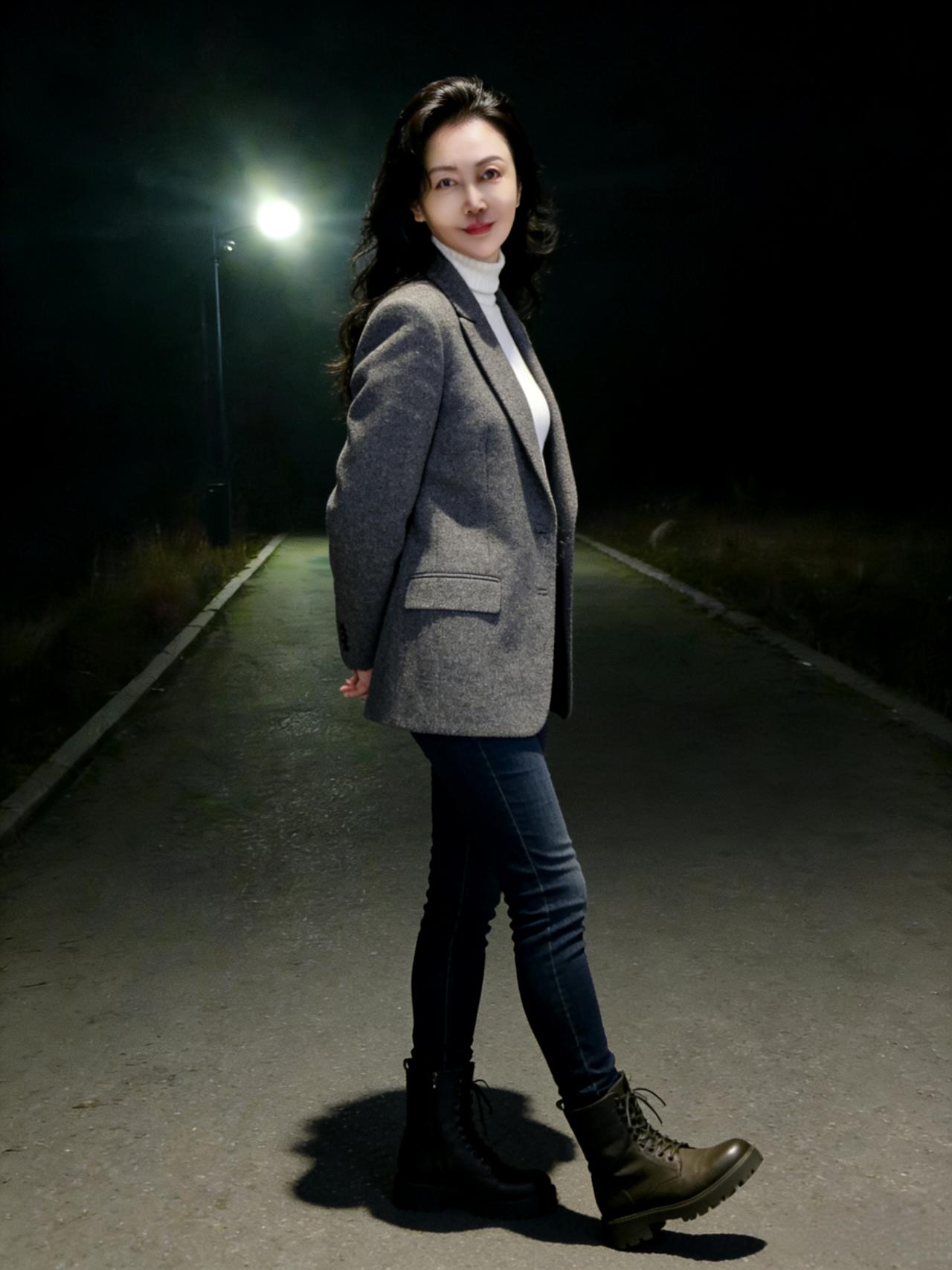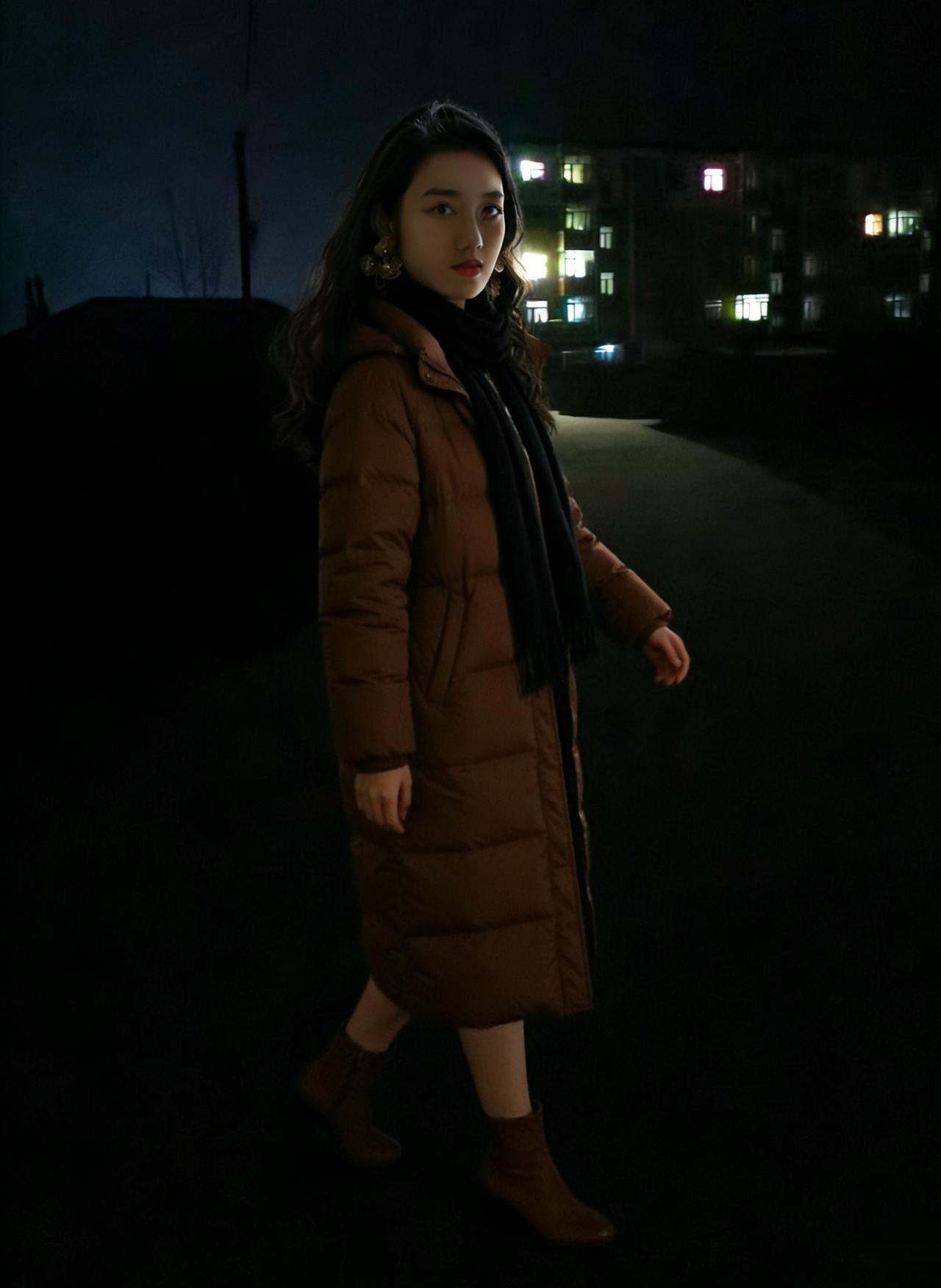 冬夜的街灯咬着树影的骨 她的风衣是浅灰的雾,漫过砖路 白裙在风里露一角月光 过膝的黑靴敲碎夜色的凉 ~ 手插在口袋时,像握住了星子的碎片 拎着的包垂着,是未说的故事的重量 她转身,卷发拂过路灯的光晕 咖啡杯在指尖,温着一寸人间的暖 ~ 树桠秃着,却似接住了她的温柔 夜色把她的轮廓磨成软的边 风掀起风衣下摆,如展开的帆 在无人的街巷,驶向寂静的岸 ~ 她抬眼时,眸光撞碎了远处的霓虹 冬的寒,在她身前矮了三分 脚步轻踩,砖纹里的凉都成了衬 衬她眉眼间,揉碎的月色与风尘 ~ 那抹红唇,是冬夜唯一的花 开在夜色里,不惹尘埃,自绽芳华 她站着,是街景里的一首诗 字里行间,都是温柔的固执 ~ 风又来,掀动她的发,她的衣 冬夜因她,有了柔软的质地 像雪落前的片刻温柔,像灯亮后的期许 她是夜色的美人,是寒里的春意