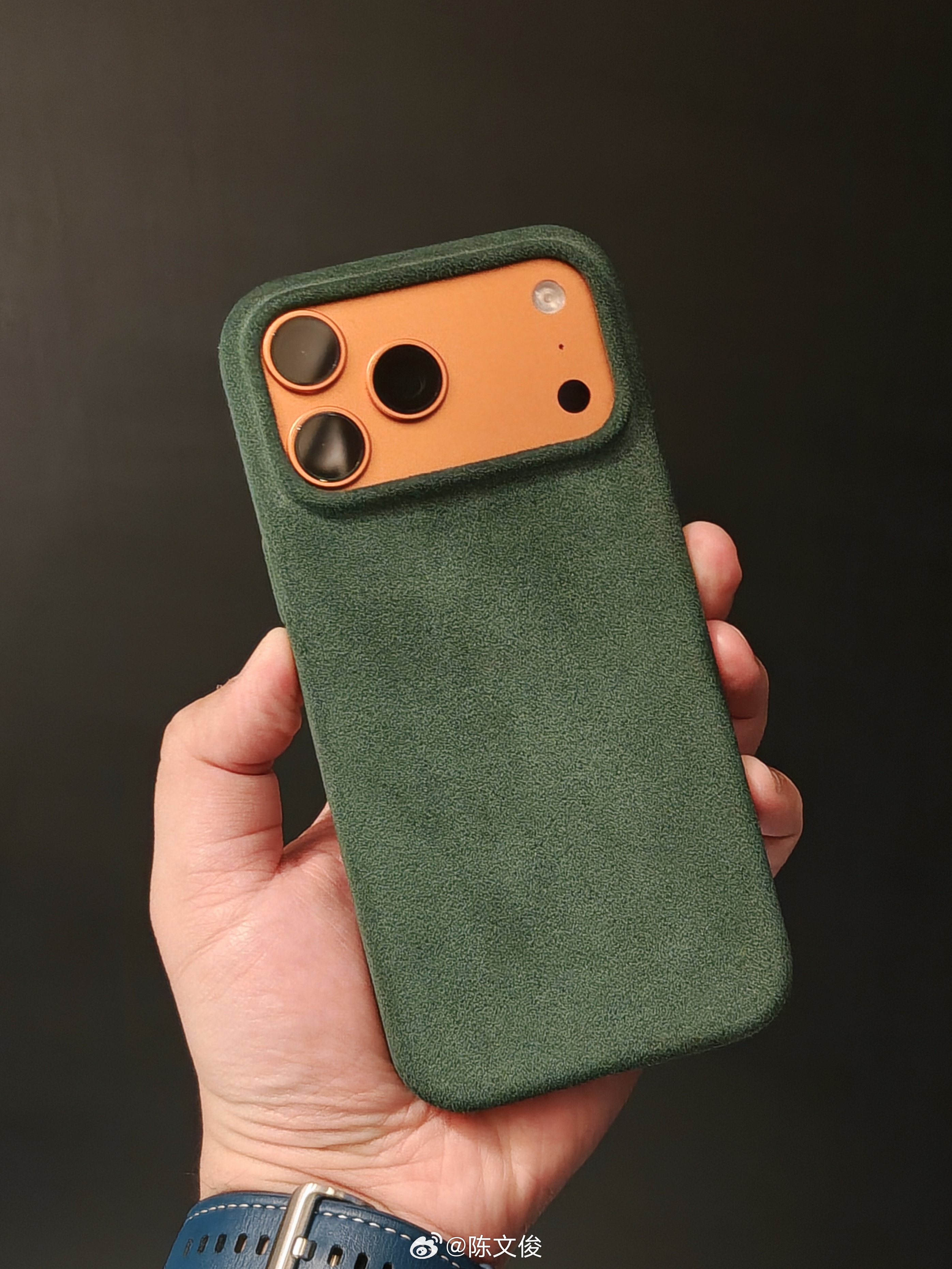 定制的欧缔兰 iPhone 壳到了,选了绿色的,全橙色太热情奔放,不太适合我这种稳重男,所以绿橙配,用沉稳的绿色遮盖着奔放的内心。这个壳是全包壳,Alcantara 面料包裹了之后,手感柔软,质感跃升。这个 MegSafe 磁吸圈是全圆,所以吸配件还是吸得比较牢,我卡包吸上去也没滑,这对于本来就是滑面料的壳来说很重要,因为搞不好就飞出去。我很喜欢它这个废键的设计,手感上废键了,但仍然有保留按键功能,这对于那厚壳很重要,因为镂空会有很明显的割裂感,这个没有。缺点?缺点就是这个壳的确厚,夏天用可能有点热,不过具体看你怎么用手机,也不至于散不了热的地步,我用过,没问题。然后就是 Alcantara 面料清洁确实有点麻烦,这点大康也有写过。至于材料细节,我不是专家,可以看的视频:网页链接牛逼就完事了。