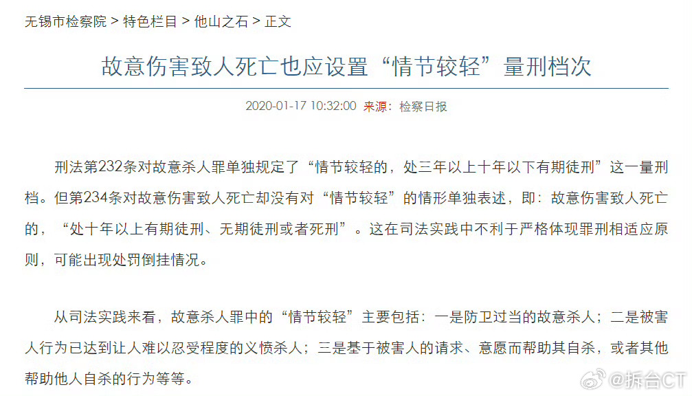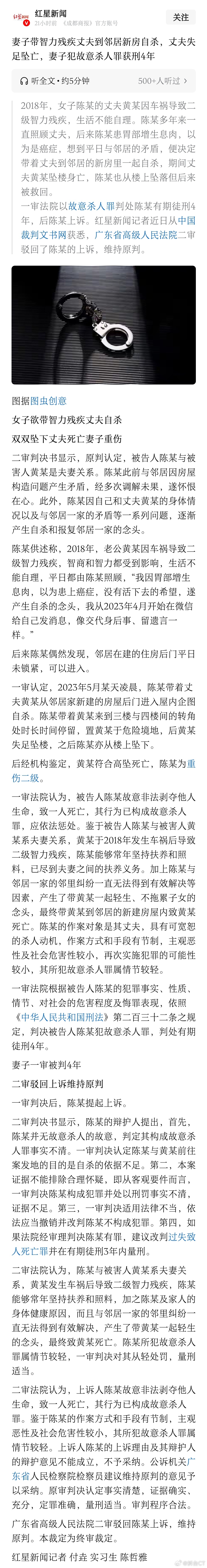这案子,认定为故意杀人罪的「情节较轻」,我认为是有待商榷的。据红星新闻报道,2023年5月的某天凌晨,女子陈某带着丈夫黄某,从邻居家新建的房屋后门进入屋内企图自杀。陈某带着黄某,来到三四楼间的转角处时长时间停留,置黄某于危险境地,后黄某失足坠楼,之后陈某亦从楼上坠下。后经机构鉴定,黄某符合高坠死亡,陈某为重伤二级。一审法院认为,被告人陈某故意非法剥夺他人生命,致1人死亡,其行为已构成故意杀人罪,应依法惩处。鉴于被告人陈某与被害人黄某系夫妻关系,且黄某于2018年发生车祸后导致二级智力残疾,陈某能够常年坚持扶养和照料,已尽到夫妻之间的扶养义务。加上陈某与邻居一家的邻里纠纷,一直无法得到有效解决等因素,遂产生带黄某一起轻生、不拖累子女的念头,最终带黄某到邻居的新建房屋内致黄某死亡。法院认为,陈某的作案对象是其丈夫,具有可宽恕的杀人动机,作案方式和手段有节制,主观恶性及社会危害性较小,再次实施犯罪的可能性较小,「其所犯故意杀人罪属情节较轻」。故,一审法院以故意杀人罪,判处陈某有期徒刑4年。陈某上诉后,二审法院亦坚持原判。的确的,刑法第232条规定,故意杀人的,处死刑、无期徒刑或者十年以上有期徒刑;情节较轻的,处3年以上10年以下有期徒刑。关于何为情节较轻,检察日报曾刊登文章称,从司法实践来看,故意杀人罪中的“情节较轻”,一般包括:1️⃣防卫过当的故意杀人,2️⃣被害人行为已达到让人难以忍受程度的义愤杀人,3️⃣基于被害人的请求、意愿而帮助其自杀,或其他帮助他人自杀的行为等。综合来看,带智力有残疾的丈夫自杀,显然不属于上述情形。据此认定其为故意杀人罪的“情节较轻”,我认为是值得商榷的。实务案例看一看