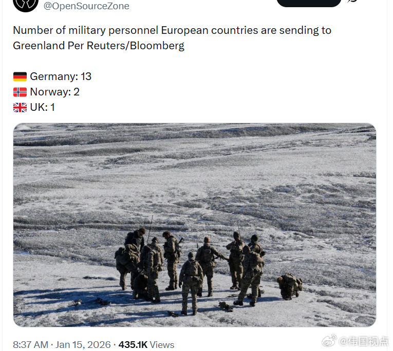 据路透 / 彭博报道,欧洲国家向格陵兰派遣的军人人数如下:德国:13 人挪威:2 人英国:1 人