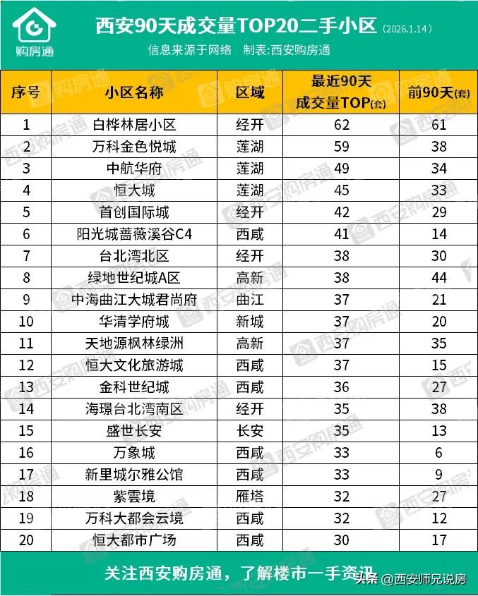 西安二手房近三个月成交top20榜单出炉,快来看看有没有你家小区,或者你关注的小区!(注:图表数据来源于西安购房通,仅供参考!)