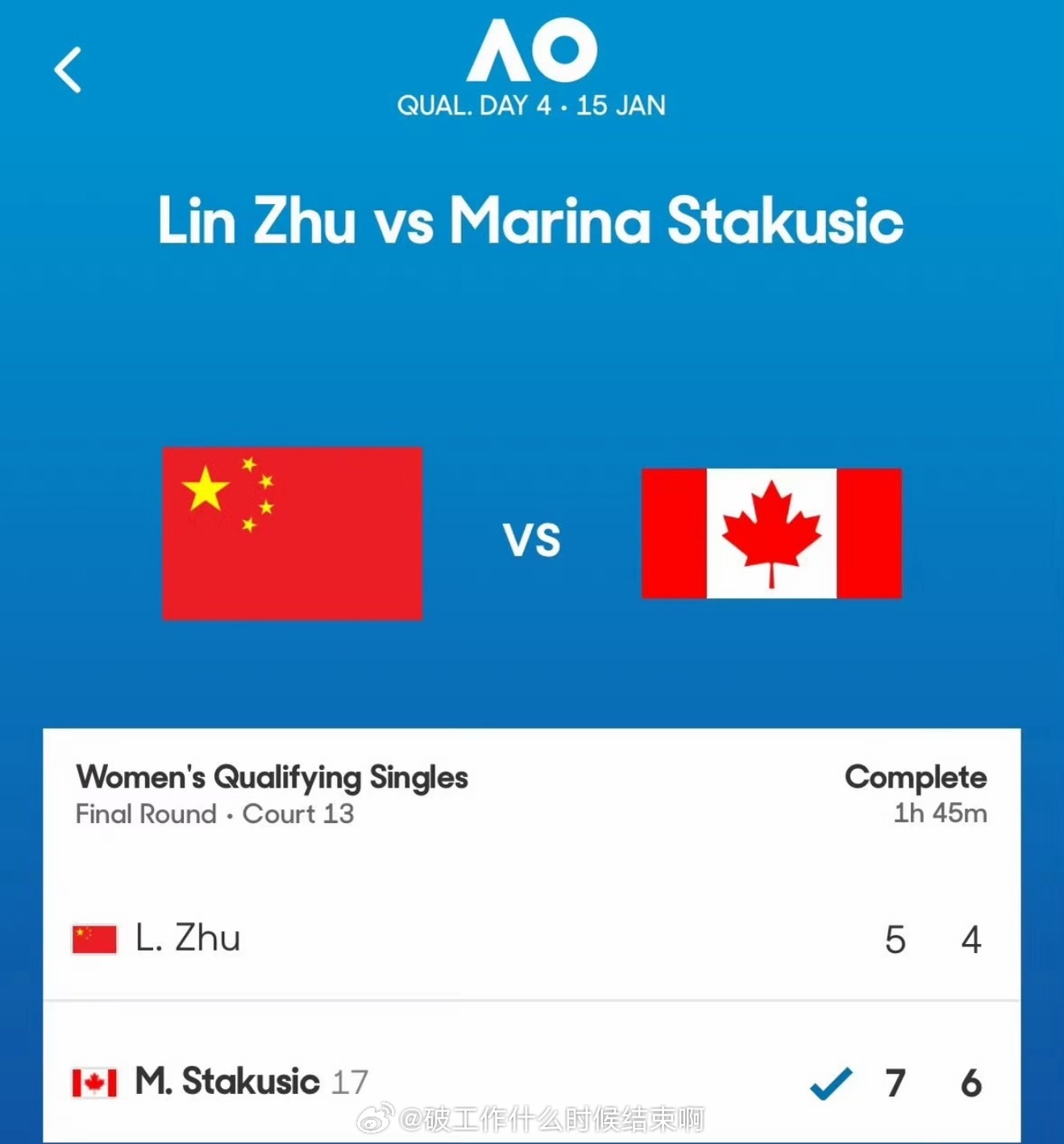 📢朱琳0比2什塔库西奇 📍【2026澳网】女单资格赛决胜轮🎾朱琳0-2(5-7、4-6)什塔库西奇,无缘正赛📝朱琳在比赛中虽然顽强拼搏,但最终未能逆转局势。什塔库西奇凭借出色的发挥成功晋级正赛。朱琳无缘澳网女单正赛这很澳网