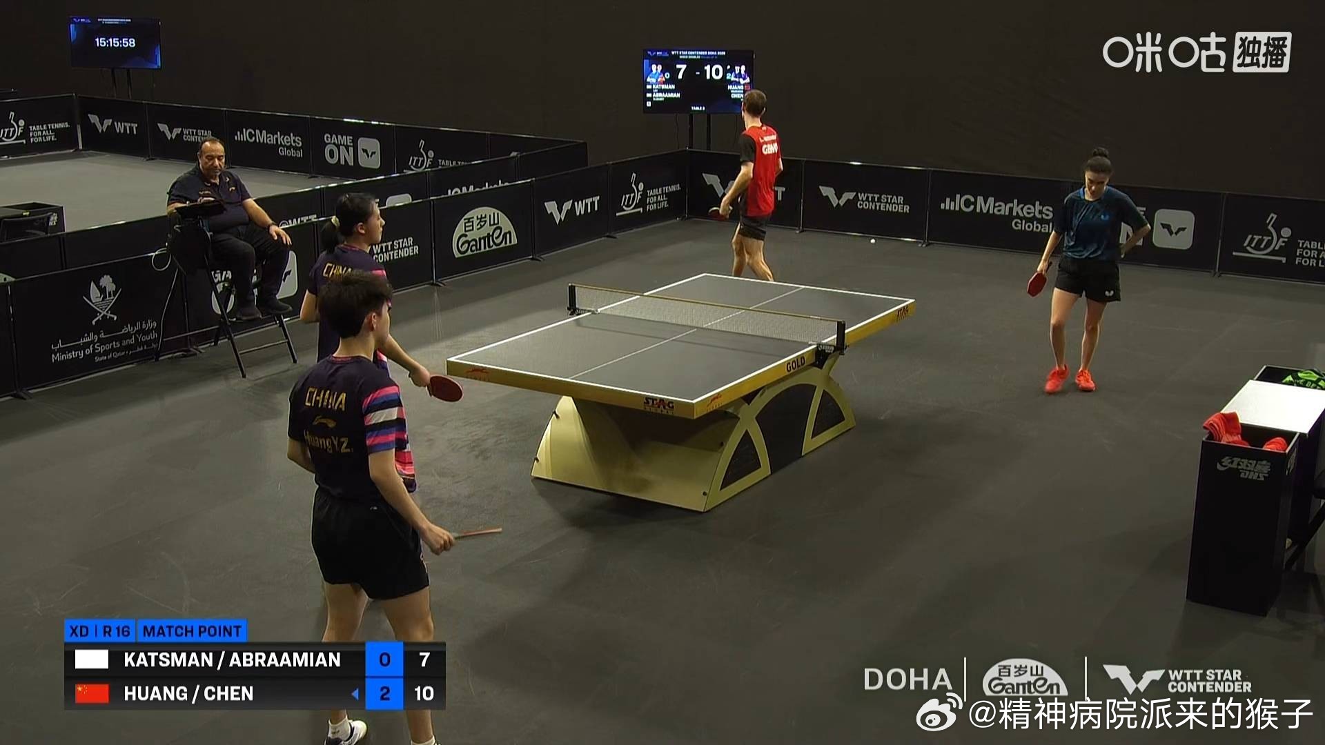 黄友政陈熠3比0卡特斯曼亚伯拉罕(7,8,8)晋级2026WTT多哈球星挑战赛混双八强下一轮将对战黄镇廷杜凯琹VS阿卜杜拉齐兹阿尔霍达比的胜者