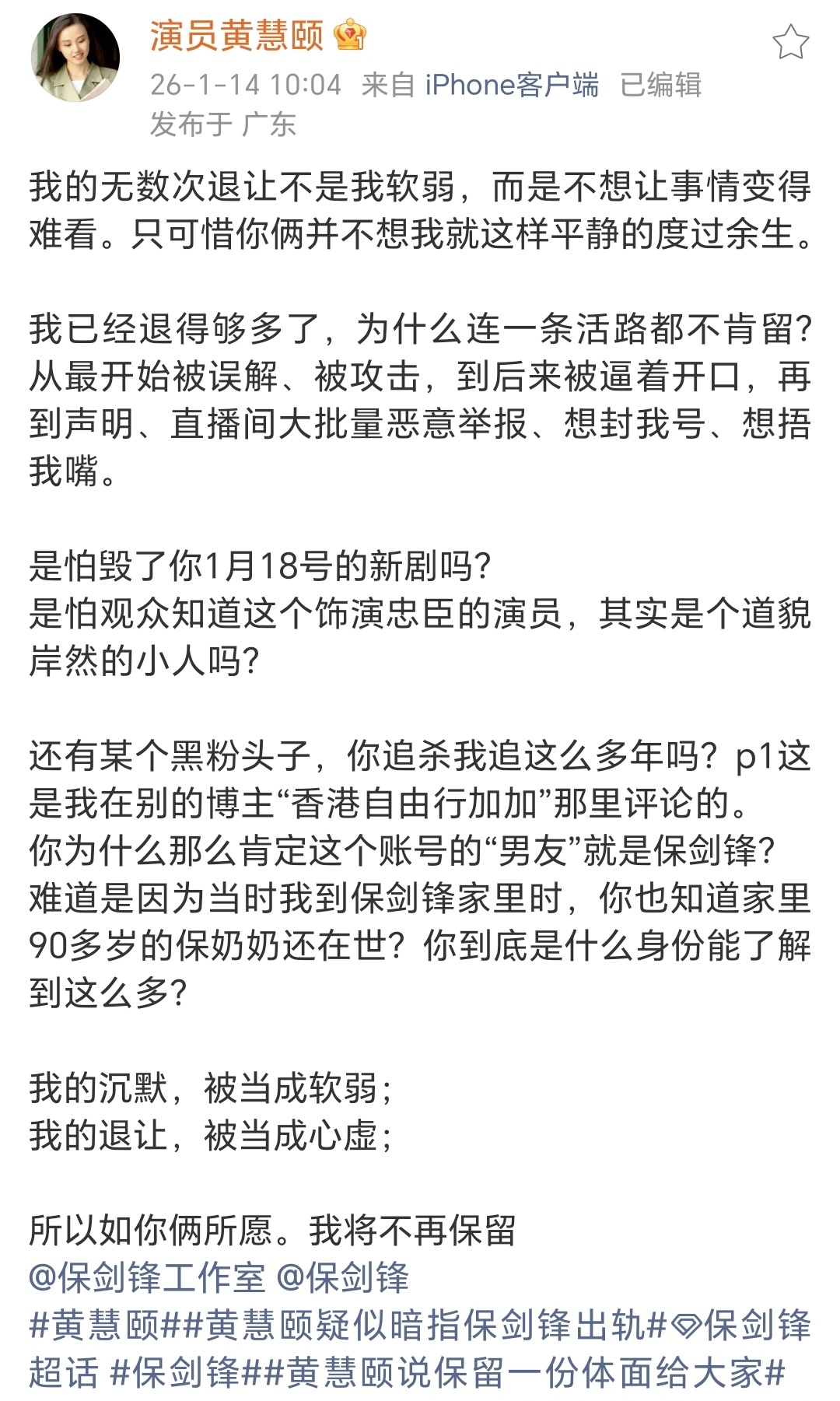 保剑锋起诉黄慧颐一瓶香水引爆二十年旧怨,黄慧颐晒旧照曝感情重叠期,保剑锋发声明诉侵权,立案已提交,真相留待法庭裁决。