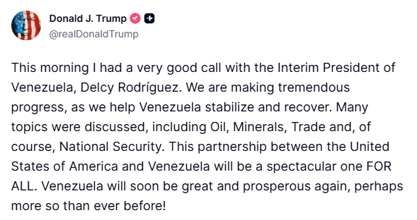 阿川与委内瑞拉代总统德尔西·罗德里格斯进行了“非常好的通话”。说要帮助委内瑞拉恢复稳定和复苏。阿川:委内瑞拉很快就会再次伟大繁荣!