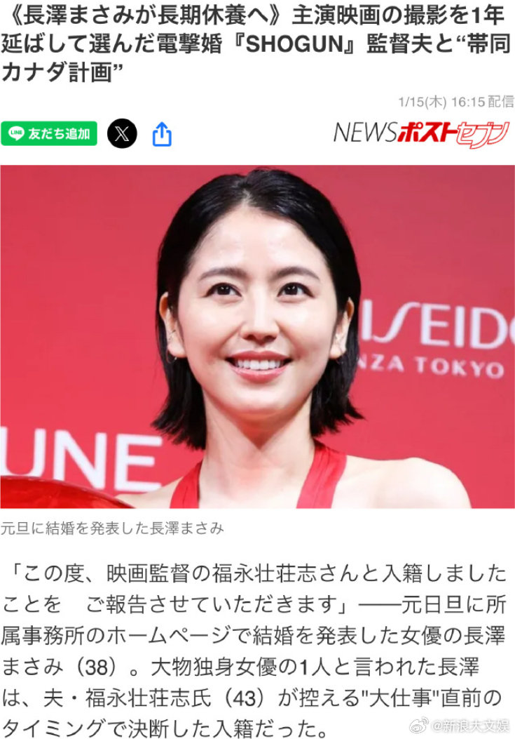 长泽雅美2026将长期休息新作拍摄因长泽雅美休假推迟据日媒,长泽雅美因为结婚将