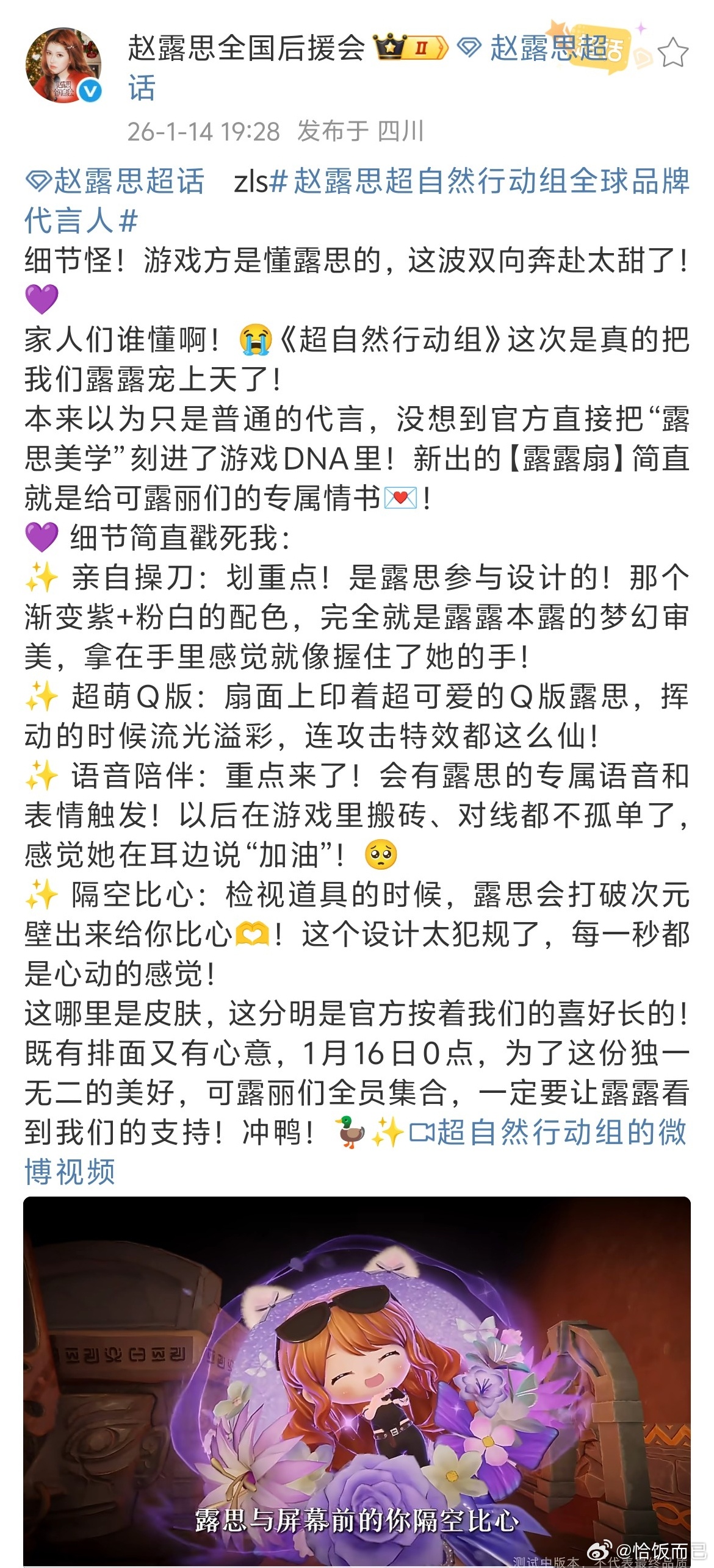 赵露思代言的《超自然行动组》最近火爆了!这几天粉丝都在聊露露扇皮肤,很统一的一个点:比心特效+语音鼓励这件事,有一种“次元壁要碎了”的感觉。因为那不是单纯“角色皮肤”,而更像是代言人本人的人格、语气和风格被放进了游戏里。这种设计思路其实挺少见的,粉丝也挺期待上线后的“氛围感”。露露扇皮肤1月16日0点上线,期待一下上线之后会不会有名场面诞生。和赵露思一起玩超自然行动组赵露思超自然行动组全球品牌代言人赵露思