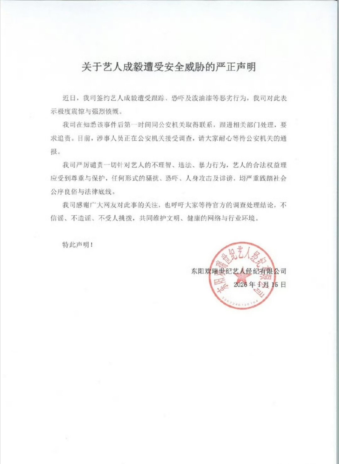 欢瑞对成毅遭受安全威胁已经报警律师解读成毅车辆被喷红漆