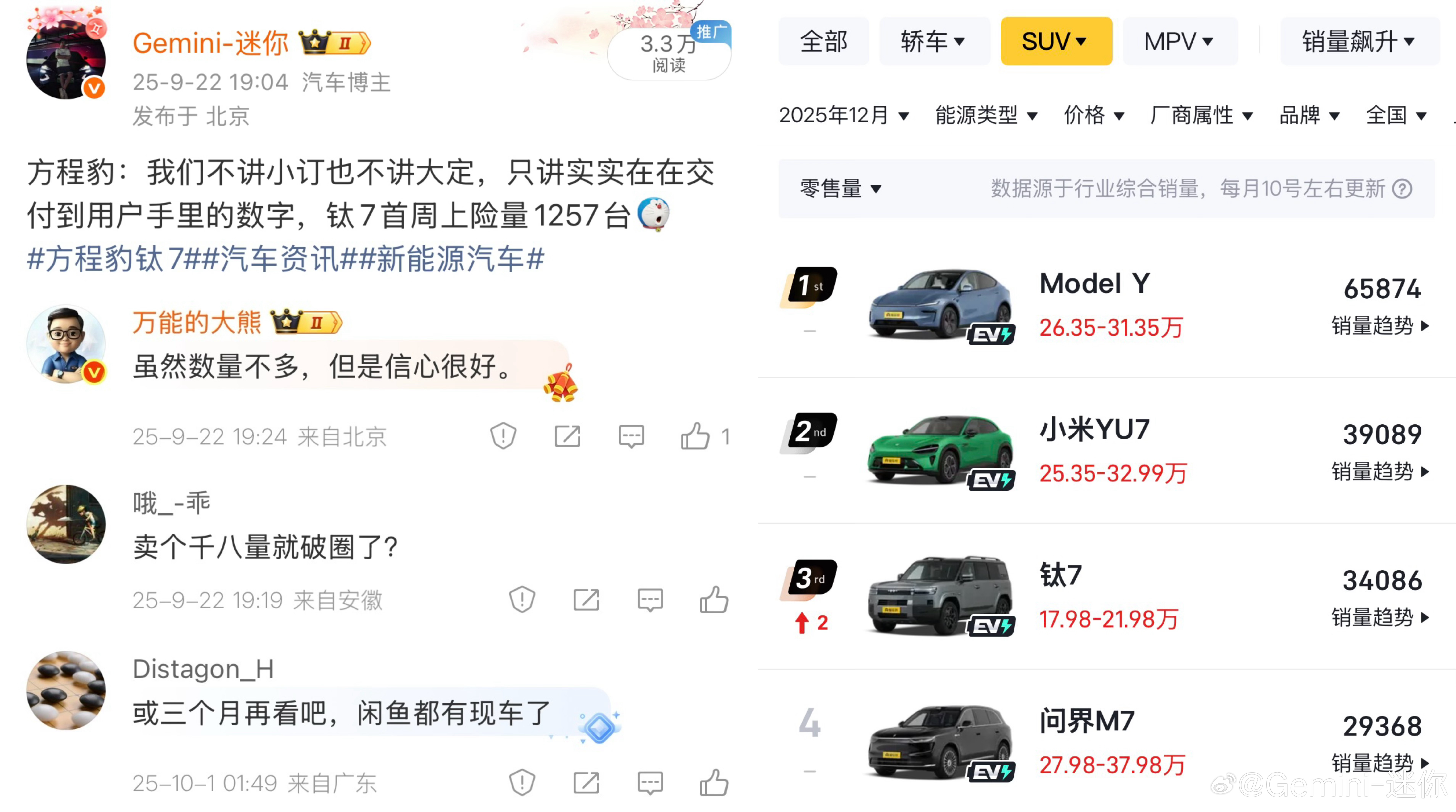 回顾一下三个月前一些人对钛7发表的评论,真的也是蛮搞笑的嗷方程豹钛7大v聊车我与汽车的日常