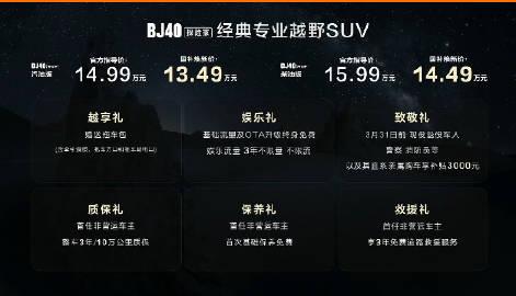 BJ40探险家13.49-14.49万价格太香了 BJ40 探险家 发动机:2.0T 变速箱:8AT 底盘:非承载式(大梁车身) 最小离地:220mm 接近角离去角:37/31° 涉水深度:750mm 四驱:分时四驱 拖拽资质:2.5吨 顶棚结构:可拆卸 屏幕:15.6英寸中控屏 车机芯片:高通8155 汽油版:13.49万 柴油版:14.49万 考虑到这一车型的粉丝都是真正的老炮,所以只做汽油版和柴油版就行了。另外这台车回去就得改,所以别想什么买个裸车就好了,这车子就是拿来玩的。这不比坦克300香啊,价格太可以了。【来自懂车帝车友圈】