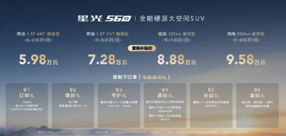 5.98-9.58w的星光560性价比不比飞度高? 基础参数:车长4545mm,轴距:2810mm(紧凑型SUV) 驱动形式:纯油/电混/纯电(前置前驱) 发动机:1.5T(92号)/1.5L(插混) 发动机功率:130kW/177Ps 变速箱:CVT/6MT 纯电续航:500km 电池:20.5kWh/56.7kWh(磷酸铁锂) 充电平台:2C(30%-80%,20min) 屏幕:12.8英寸中控屏 灯光:智能自动大灯 底盘:前麦弗逊后多连杆 接近角/离去角:17°/22° 轮毂尺寸:R18/215/55+胎压显示 后备箱:763-1945L 外观:蓝/灰/白/黑 内饰:暖棕/沙棕 屏幕:全液晶仪表盘+12.8寸中控屏 座椅:魔术座椅/后排32L储存空间 灯光:LED远近光、转向辅助、后尾灯、高位刹车灯 其他配置:多功能方向盘、主副驾安全气囊、儿童安全锁、自动落锁、220V对外放电(电混/纯电)、全景天窗、座椅加热、后驻车雷达 1.5T 6MT舒适型 5.98w 主副驾气囊/车窗一键升降/LED远近光灯 1.5T CVT精英型 7.28w 主驾电调/12.8中控屏/外后视镜加热/自动驻车/6喇叭/车顶行李架/倒车影像/AutoHold驻车/6扬声器 125KM  豪华型 8.88w 1.5L发动机/5.3L友好/手机互联/对外放电/125km纯电/综合1100km续航 500KM 豪华型 9.58w 56.7kWh电池/2C快充/无感进入/无感启动/电子怀挡/蓝牙要是/外放电/手机互联 上市礼: 3000元置换补贴(以上价格已包含) 1000元抵2000(过年前) 听劝了不少,预售价比之前低了,整体性价比很高,油车自动挡入门只要7.28万,混动8.88万,纯电也只要9.58万。教授觉得还是纯电版性价比最高,基本不用怎么考虑了。说说特点,五菱在做这台车,多方面考虑了空间的应用,可以说是全面过度到10万以下最有性价比的SUV方向走了,真心不错。【来自懂车帝车友圈】