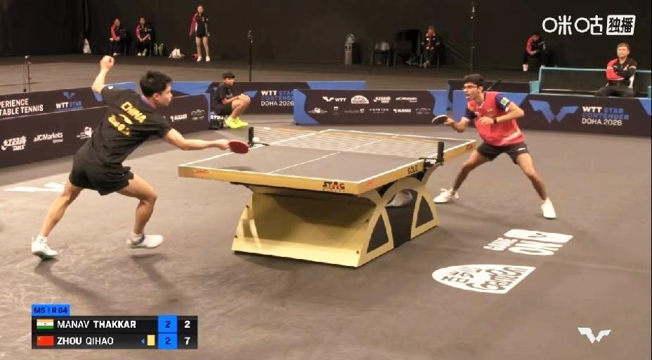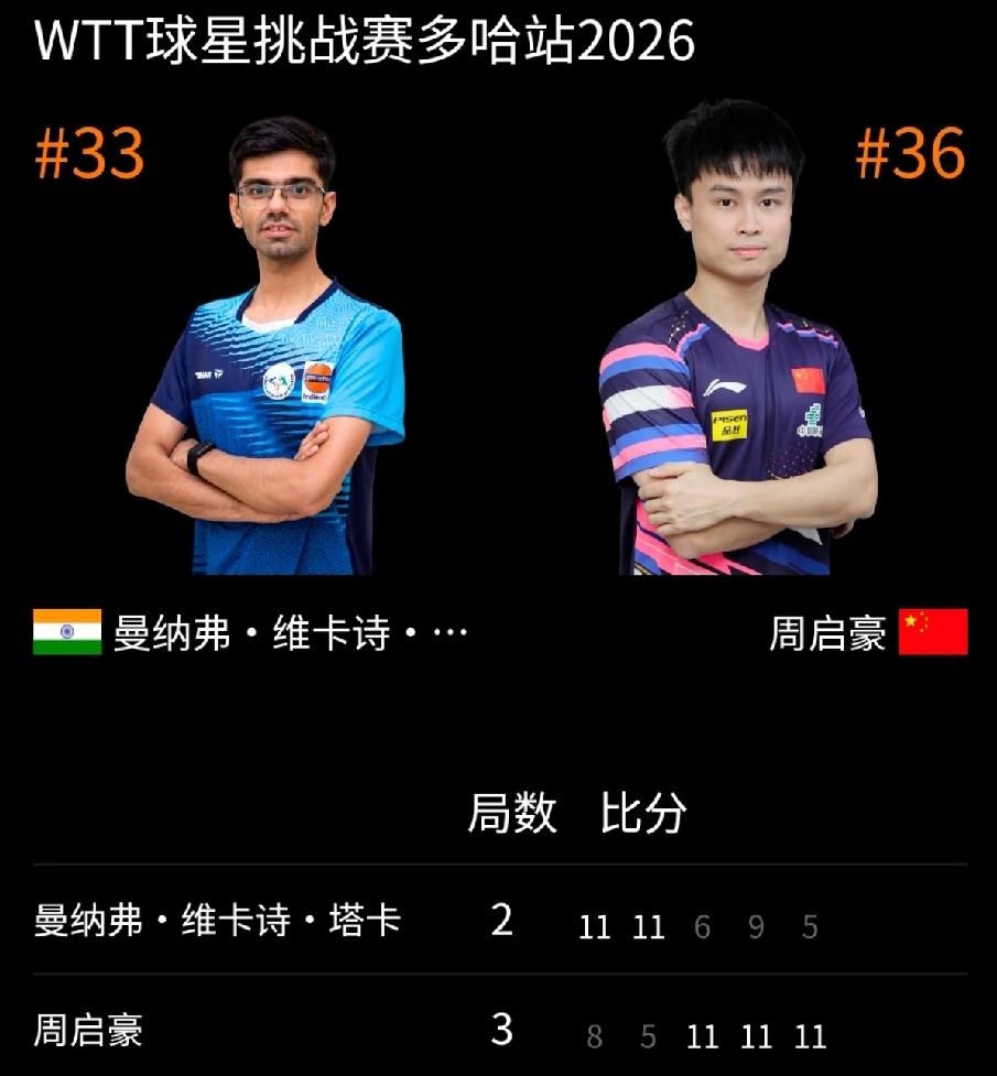 这压迫感, 志强教练场外指导, 王皓坐在不远处直勾勾的看着, 这比赛真是令人瞩目。 志强教练真是命苦, 没有梁靖崑的比赛, 还是来了个让二追三, 周启豪是紧随他甜甜哥的脚步呀。 在比赛过程中, 可能地面太滑, 7号在接球的时候劈了个叉, 就在缓神的功夫, 得了个黄牌。 更有意思的是志强教练在场外指导, 王皓还坐在后边看, 这两苦命的人心里真是急呀, 恨不得自己上场。 赛后王皓还给周启豪复盘, 真是尽职尽责, 既敬业又命苦。 恭喜周启豪晋级32强, 虽然下一轮对战梁靖崑, 总归是没有输给外协。 (图片源自于网络)