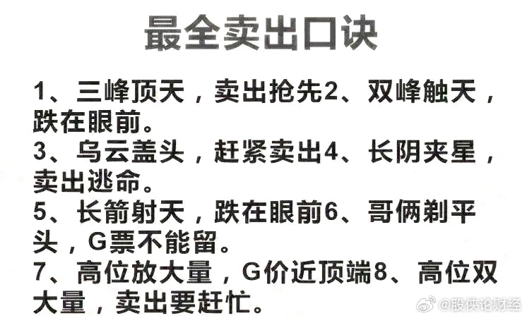 最全卖出口诀1、三峰顶天,卖出抢先2、双峰触天,跌在眼前。3、乌云盖头,赶紧卖出4、长阴夹星,卖出逃命。5、长箭射天,跌在眼前6、哥俩剃平头,G票不能留。7、高位放大量,G价近顶端8、高位双大量,卖出要赶忙。金融财经知识分享官股票股票炒股技巧炒股今日看盘上证指数a股财经股票财经股市分析微博财经上市公司晚间公告集锦