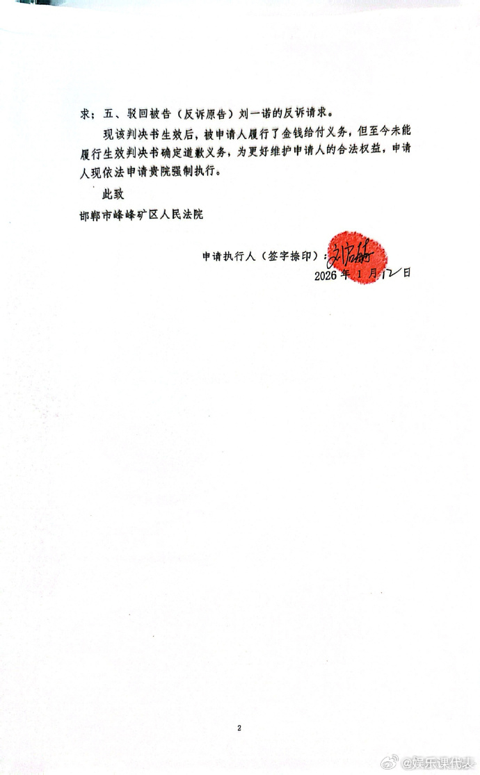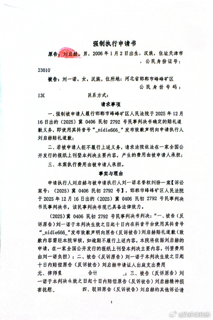 刘启赫申请强制执行刘一诺刘一诺被申请强制执行 刚刚,刘启赫晒强制执行书,要求刘一诺赔礼道歉。↓