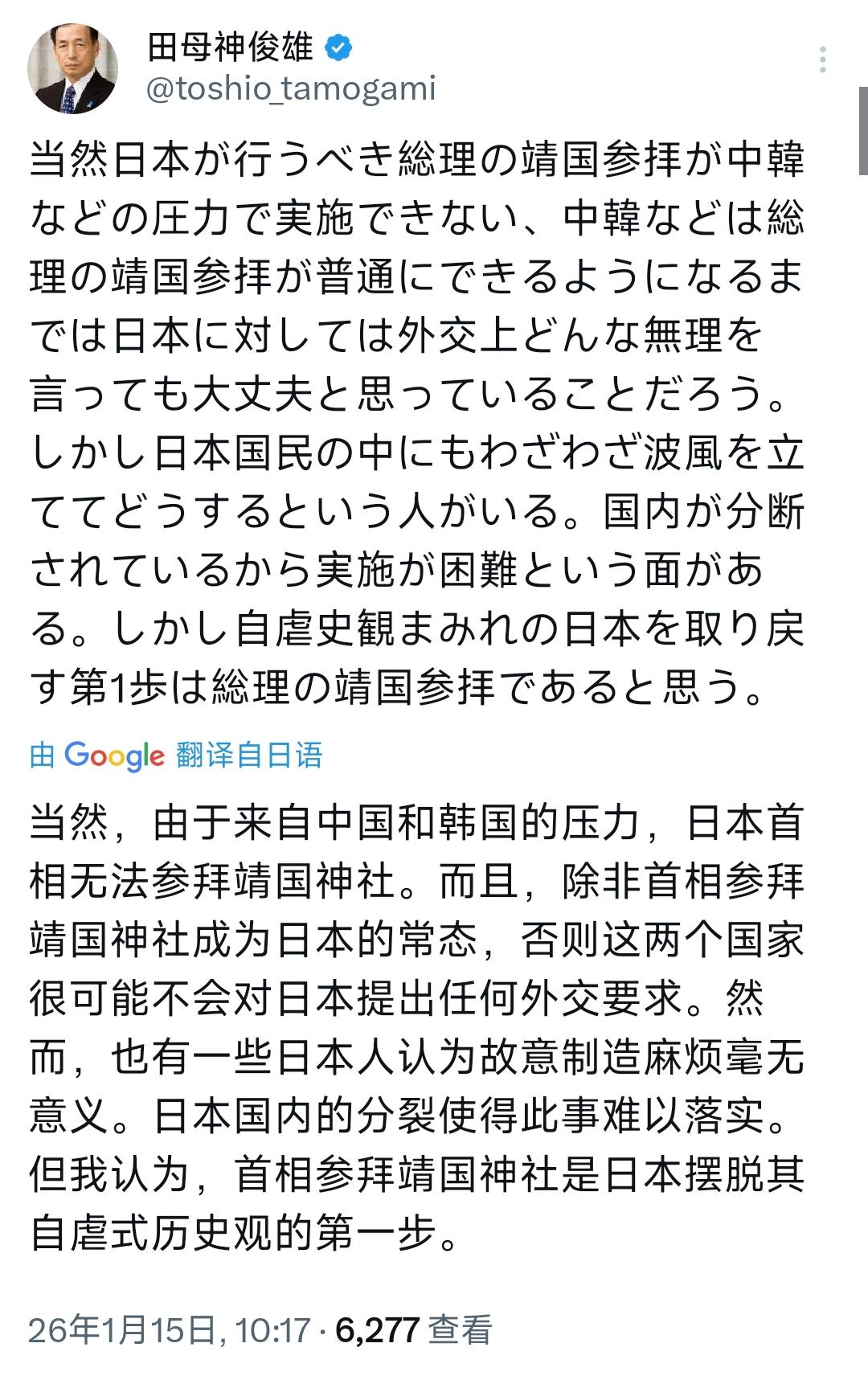 高市早苗没参拜成靖国神社,对此,日本右翼的“招魂党”又跳出来带节奏了。1月15日,他发文表示:“当然,由于来自中国和韩国的压力,日本首相无法参拜靖国神社。而且,除非首相参拜靖国神社成为日本的常态,否则这两个国家很可能不会对日本提出任何外交要求。然而,也有一些日本人认为故意制造麻烦毫无意义。日本国内的分裂使得此事难以落实。但我认为,首相参拜靖国神社是日本摆脱其自虐式历史观的第一步。” 乍看上去,田母神俊雄这番话是在为日本的“民族尊严”呐喊。他把日本在外交上的被动,全都归咎于首相不敢去那座臭名昭著的神社,甚至认为只要去了,中国和韩国就会闭嘴,不再提任何外交要求。这种逻辑在一些日本极端选民听来,确实很有煽动性,仿佛参拜一次就能让日本重新变成“强国”。 然而,这种言论恰恰暴露了日本右翼内心深处最极端的焦虑和虚弱。 说白了,田母神俊雄这番话不是发给邻国听的,而是发给日本现任内阁听的“催命符”。就在本周,日韩首脑刚刚在奈良进行了会晤,试图通过文化交流绕开历史死结,缓和紧绷的地区局势。田母神选在这个节骨眼上“招魂”,本质上是在搞破坏,他害怕看到日本政府在历史问题上表现出哪怕一点点的理性和退让。 问题在于,历史观这种东西,从来不是靠去神社“打卡”就能强行扭转的。田母神口中所谓的“自虐史观”,其实就是国际社会公认的正义史观。他想通过参拜来寻找的“自信”,说到底是一种自欺欺人的精神鸦片。 这就好比一个落魄的旧贵族,家里早就揭不开锅了,年轻人连仗都不愿意打,却非要在那显摆祖辈抢来的那点破铜烂铁。 就是说,田母神以为参拜是“强心针”,只要日本首相踏进那座大门,日本辛辛苦苦经营的周边外交就会瞬间崩塌,所谓的“摆脱外交被动”只会变成彻头彻尾的外交孤立。 之所以这帮右翼政客乐此不疲地折腾历史问题,是因为他们已经拿不出任何能让日本重新崛起的实招了。现在的日本,人口在萎缩,经济在停滞,自卫队连招兵都困难。在硬实力无法突破的瓶颈下,他们只能转而追求这种廉价的、带有破坏性的“精神胜利法”。 往深了说,田母神俊雄的恐慌其实是一种心虚。他知道那段历史是日本永远绕不过去的坎,他也知道随着国际格局的变化,日本通过跟随霸权来掩盖历史罪责的空间越来越小。所以他才要拼命地喊,试图用这种极端的表态来证明自己还有存在感。 实事求是讲,一个国家的尊严从来不是靠参拜战犯换来的。真正的强国,敢于直面历史的阴影,更有能力解决现实的危机。像田母神这样,试图靠参拜神社来摆脱“自虐”,除了能给邻国提供更有力的反制理由,除了让日本在全世界面前再丢一次脸,没有任何实际意义。 说穿了,这不过是一个活在旧梦里的老人,在用最拙劣的方式,为一个正在失去方向的国家寻找虚假的安全感。这种建立在谎言和狂热之上的“第一步”,注定只会让日本在错误的道路上越走越远。 以上是小编个人看法,如果您也认同,麻烦点赞支持!有更好的见解也欢迎在评论区留言,方便大家一同探讨。
