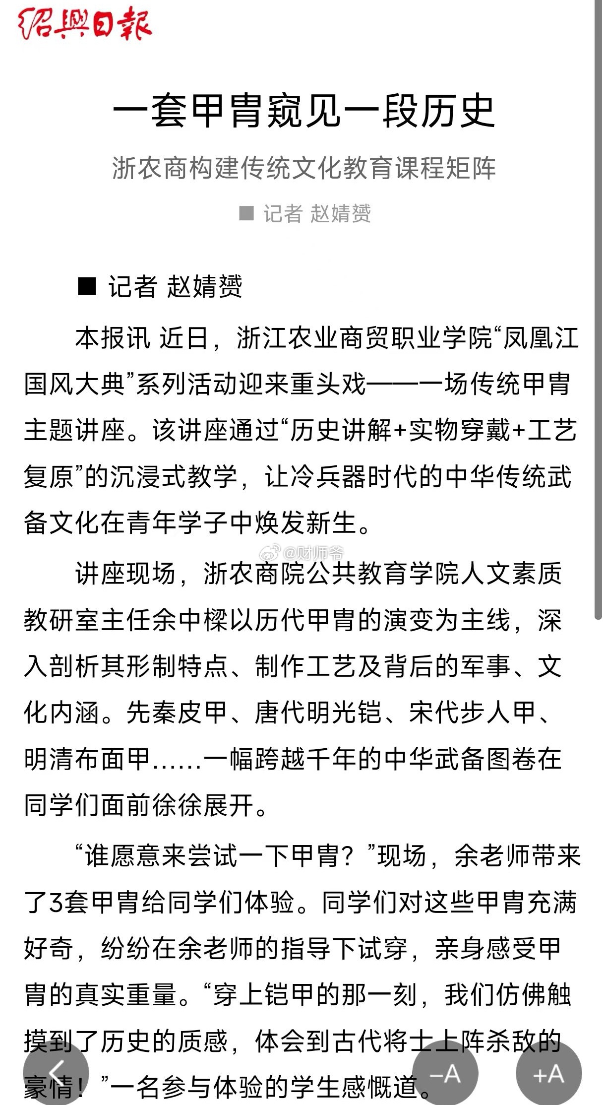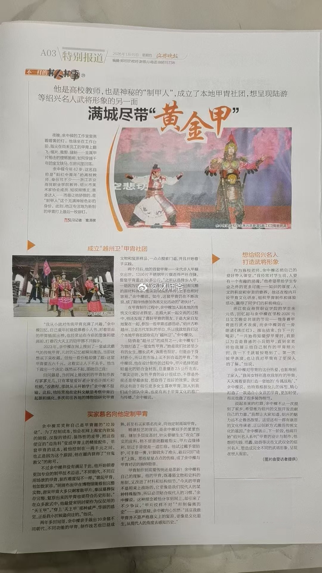 “中华甲胄文化”绍兴传承人——余中樑余老师,凭借着对“中华甲胄”的钟爱,创立了【越州卫】甲胄社,弘扬充满阳刚之气的中华武备文化!财师爷看了很激动,不禁灵感大发,赋诗一首:《中华甲胄》鳞甲凝霜映日辉,寒锋护国展雄威。千年铁骨承薪火,一脉龙魂铸甲衣。——于2026年1月15日历史那些事