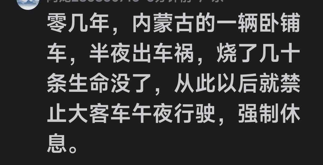 原来禁止🚫凌晨长途大巴行驶,原因是一辆长途卧铺大巴在半夜途中起火有点关系的。 也从那以后,交通部为群众安全考虑,开始禁止大巴在凌晨2点至5点这3个小时内在高速公路上行驶。 但世界上飞机✈️空难也时有发生,为何不将飞机一禁了之呢? 二者性质难道不一样吗?