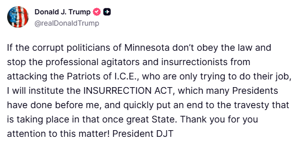 🐖 特朗普:“如果明尼苏达州的“腐败政客不遵守法律”,不阻止“职业煽动者和叛乱分子攻击”美国移民及海关执法局(ICE)的“爱国者们”(他们只是在履行职责),我将颁布“《叛乱法》”,就像“许多总统”在我之前所做的那样,“迅速制止”在这个“曾经伟大的州”发生的闹剧。”对于MAGA而言,他们习惯把所有攻击美国大兵以及大兵家属的人比作畜 生,但这样的大畜 生现在就在白宫玻利瓦尔英雄之地ICE枪击事件引发大规模抗议