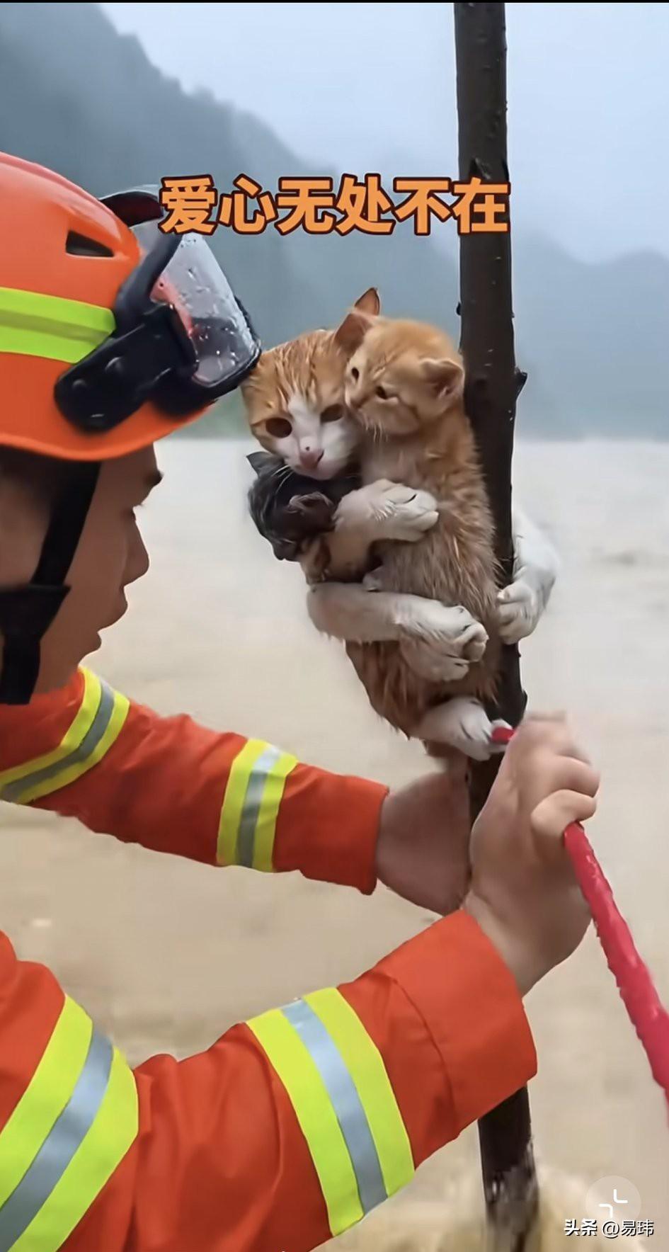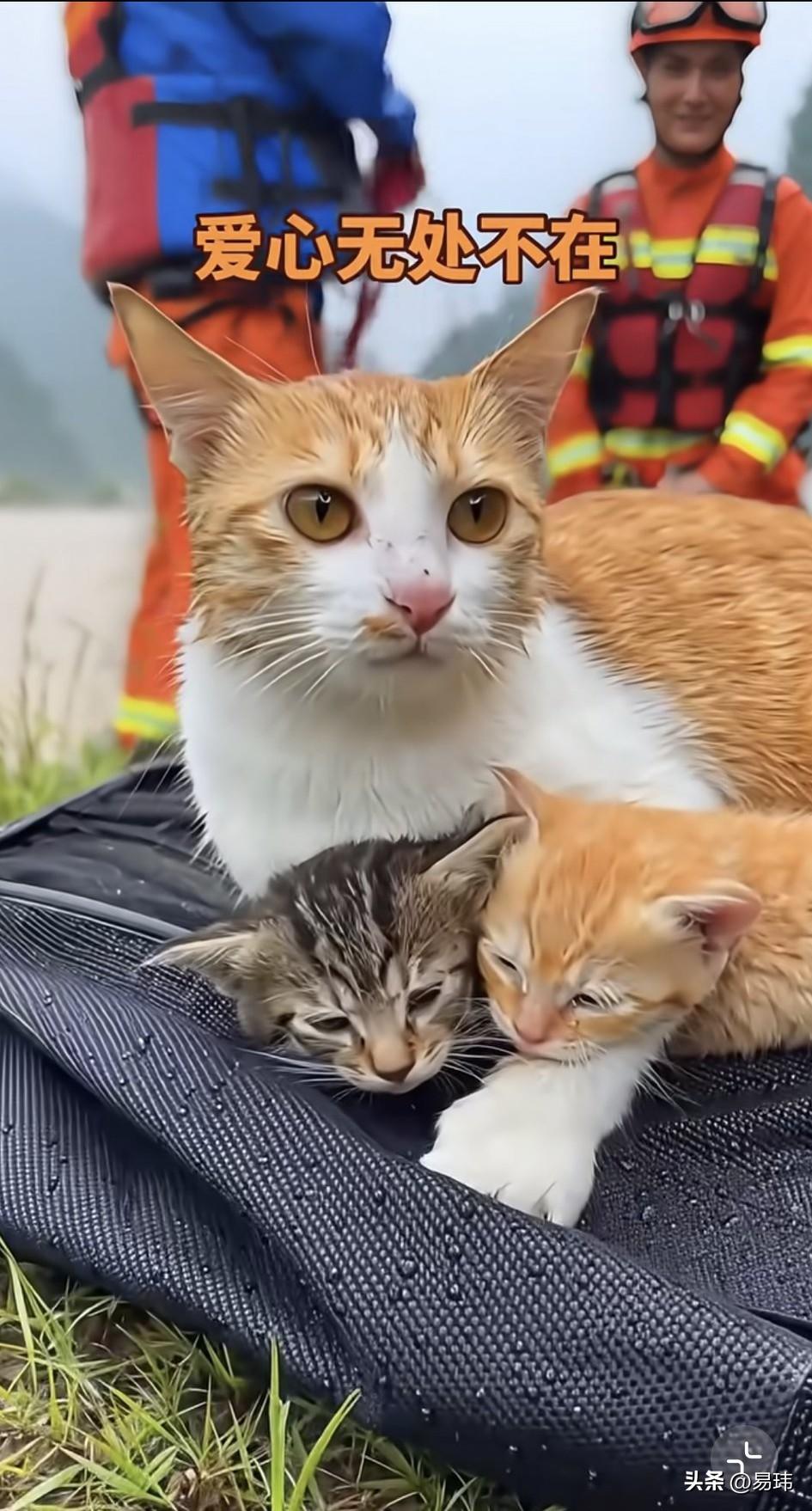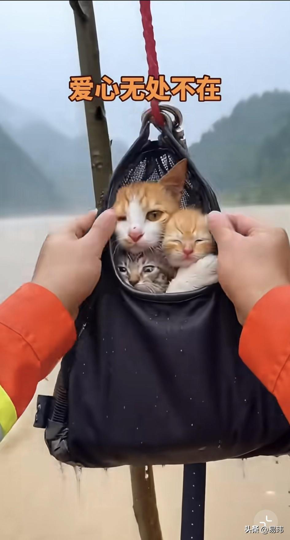 泪目了!一只流浪猫妈妈的家被洪水淹没了,它拼尽全力才带着两只小奶猫爬上一棵小树,它用前爪紧紧地抱着两只小猫,两只后腿则抓住树干。它们的身下就是来势汹汹的洪水,只要滑落后果不堪设想,而长时间的用力也让猫妈妈筋疲力尽。 眼看它就要支撑不住了,这时候岸边出院了几位救援队小哥哥,他们发现了被困的猫妈妈一家,于是立刻展开了救助,一位小哥哥绑上了安全绳之后就来到了猫咪身旁,然后把它们装在了一个袋子,然后把袋子系在看绳子上。就这样被岸上的同伴拉回了岸边,猫妈妈一家就这样被救了。之后善良的小哥哥还收养了它们,相信在他的照顾下,猫妈妈一家也会越来越好的。