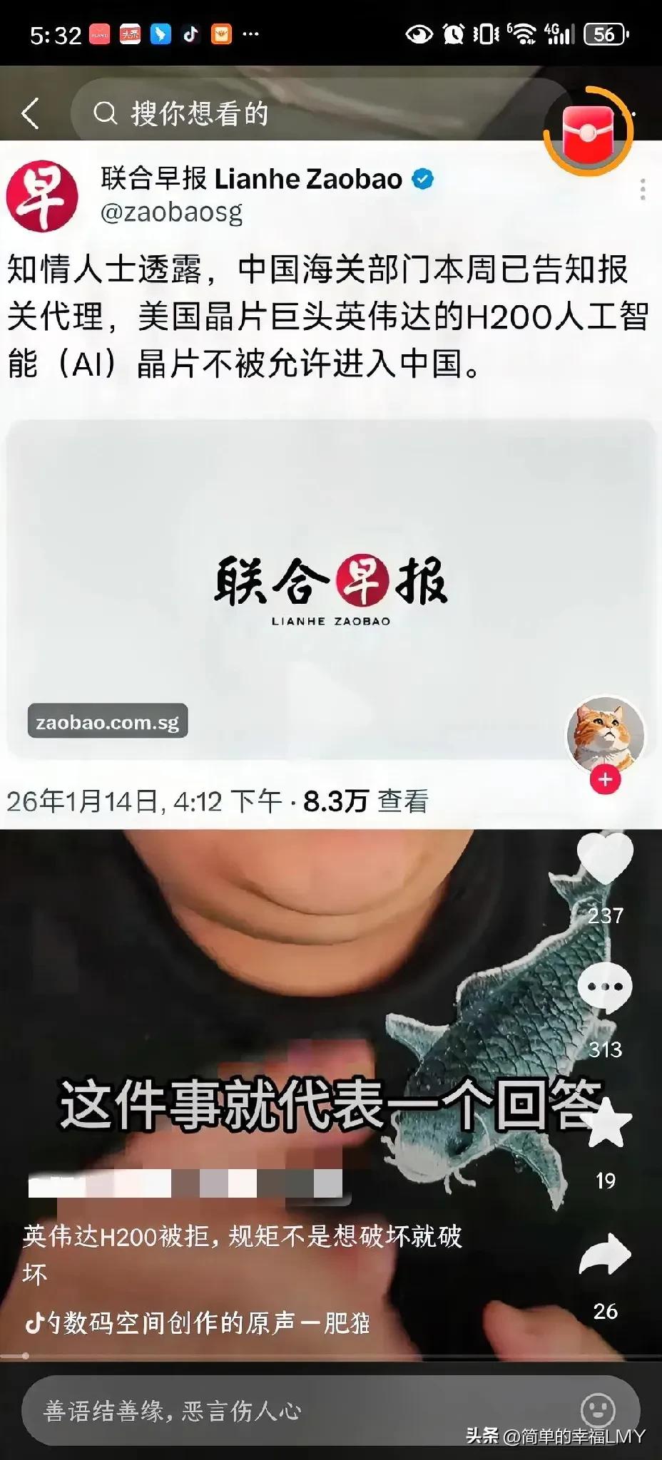 白宫允许H200芯片对华出售后,中国海关紧急叫停,不接受无理条件! 白宫松口让英伟达H200芯片对华出售,没等美方高兴多久,海关这边就踩了刹车。明面上没下禁令,可实际上进口通道差不多堵死了。这波操作,看似突然,细想全是门道。 事情得从1月13日路透社的消息说起。美国高调宣布“有条件”放行H200芯片出口,满打满算还不到一个月。当时不少人以为是管制松动,可看清附加条款,才发现全是坑。 白宫给的条件,条条都透着算计:英伟达得把对华销售额的25%交给美国财政部,出口许可说撤就能撤,所有交易还得过美方的安全审查。这哪是做生意?分明是拿根绳子套住买家的脖子。 英伟达自己也跟着加码,开出的商业条件苛刻到离谱。买家必须先付全款,货到手了想退?门儿都没有。更绝的是,芯片交付前,美方还要来检查一番。 这就有意思了,钱先给了,货能不能用、有没有猫腻,全凭人家说了算。有业内人士说得实在:“芯片里有没有藏着‘监控器’都不知道,谁敢用它跑核心业务?这不是把自家家底往别人眼皮子底下送吗?” 美方打的算盘,明眼人一看就透。给点甜头让芯片进来,既想占中国市场的便宜,又想借着这些附加条件卡脖子,顺便打压中国本土芯片企业。算盘噼啪响,可他们忘了,大家不是傻子。 这种摆明了不公平的条件,真当别人会捧着钱求着买?想想也可笑,美方一边喊着“开放”,一边在交易里塞满霸王条款。既要赚中国的钱,又想拿捏技术命脉,天下哪有这么好的事? 就像有人端着碗饭过来,说“给你吃,但每口都得经我同意,吃剩下的还得分我一半”,换谁愿意受这窝囊气?做生意讲究个平等互利,强买强卖还附带一堆无理要求,谁也不会答应。 暂停进口,不是不要芯片,是不接受这种带着枷锁的交易。这些年中国在芯片领域下了多少功夫?从设计到制造,一步步往上赶,图的就是不再看人脸色。 现在美方想凭着一款芯片就故技重施,把我们圈进他们的规则里,未免太天真了。再说,真把这种芯片用在关键领域,风险可不是一般的大。 美方保留随时撤销许可的权力,意味着今天能用,明天可能就被断供。全额预付还不能退货,等于把所有风险都转嫁给中企。 更别说芯片里可能藏着的“后门”,一旦被远程操控或者植入限制,损失的可不止是钱,还有核心技术的安全。这种险,谁也不敢冒。 美方大概以为,放出H200芯片就能让中企趋之若鹜,就能扼杀本土芯片的发展。可他们没算到,中企的骨气和远见。这些年被“卡脖子”的滋味尝多了,反而逼出了自主创新的狠劲。 现在国产芯片虽然还有差距,但在不少领域已经能顶上来。与其花大价钱买带枷锁的进口货,不如把钱投到自家技术上,哪怕慢一点,至少走得踏实。 说到底,这不是简单的芯片买卖,是技术话语权的较量。美方想借着芯片出口设套,我们自然不能往里跳。暂停动作,是在告诉世界:生意可以做,但得按规矩来,想搞霸权那一套,门都没有。 未来的芯片市场,拼的是谁更有底气。美方要是继续抱着这种“既要又要”的心态,只会把更多机会让给本土企业。毕竟,谁也不想永远做别人砧板上的肉。 这次暂停进口,看似是拒绝一款芯片,实则是在为自主创新铺路。这条路难走,但走通了,就是海阔天空。