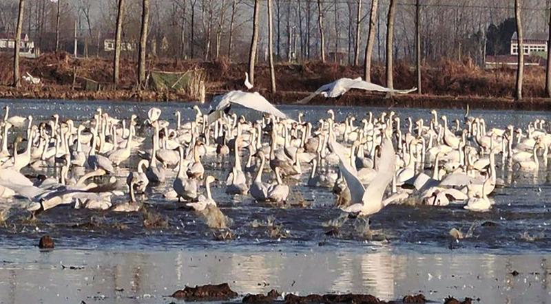 2002年开始,李四记便在霍邱县孟集镇王圩村竹园大圩承包圩田,目前约有300亩。由于靠近该县城东湖,这些圩田用于种植水稻、养殖龙虾等,多年来一直稳稳当当。但自前年开始,每到隆冬季节就有一群“不速之客”光临圩田,让他寝食难安。记者了解到,这群“不速之客”就是成千上万只从北方赶来越冬的天鹅。
