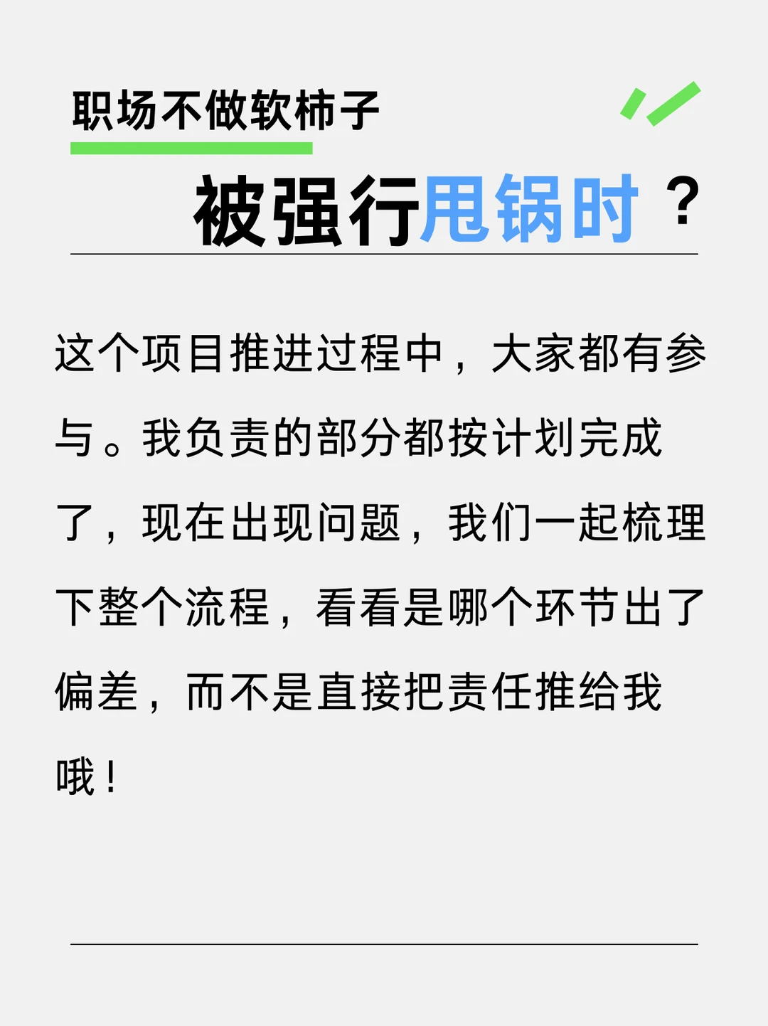 “这个项目推进过程中,大家都有参与。我负责的部分都按计划完成了,现在出现问题,我们一起梳理下整个流程,看看是哪个环节出了偏差,而不是直接把责任推给我哦🙅♀️”