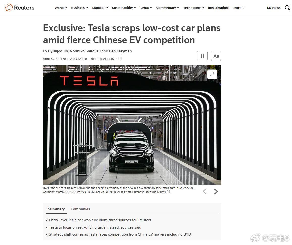 特斯拉已停止开发Model 2 日经中文网消息,特斯拉先前的2.5万美元级全球战略车型Model 2(好像一直没有正式名字,这么叫比较好理解)已经停止了开发工作。有消息人士称,Model 2的叫停可以追溯到2024年初。这和当时路透社透露的消息(图2)能呼应得上,但马斯克马斯克以“路透社撒谎”的似是而非的回应应对过去了——马斯克一直没有点明路透社的消息不实在哪里。现在看来,也许那时的马斯克是在以这种方式稳定特斯拉股价? 新能源汽车汽车资讯