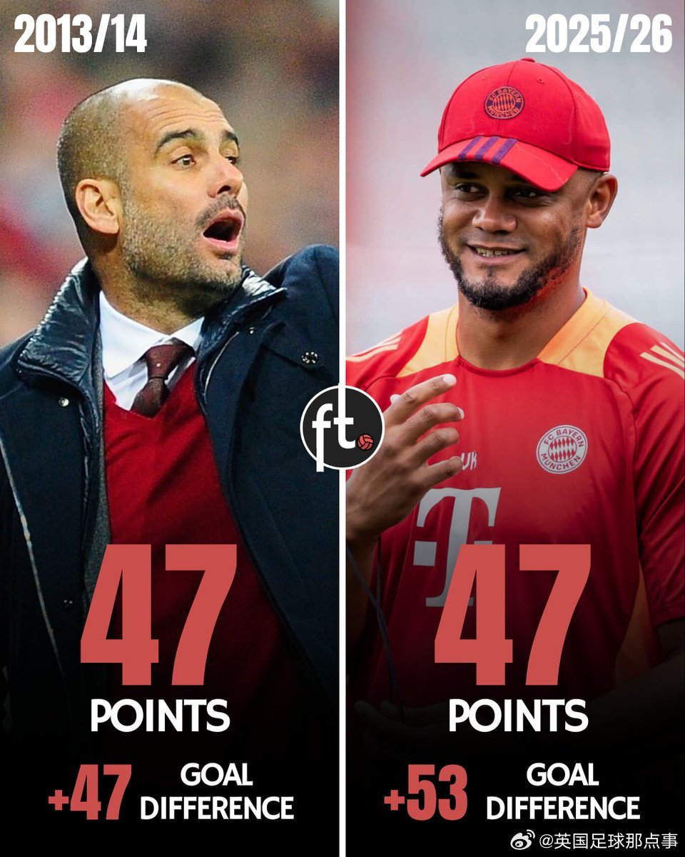 【孔圣!】孔帕尼执教的拜仁在德甲上半程拿到 47分、净胜球+53,创造了德国顶级联赛历史上最强半程战绩。此前的纪录同样由拜仁保持——2013/14赛季瓜迪奥拉麾下的拜仁也是47分,但净胜球为 +47。
