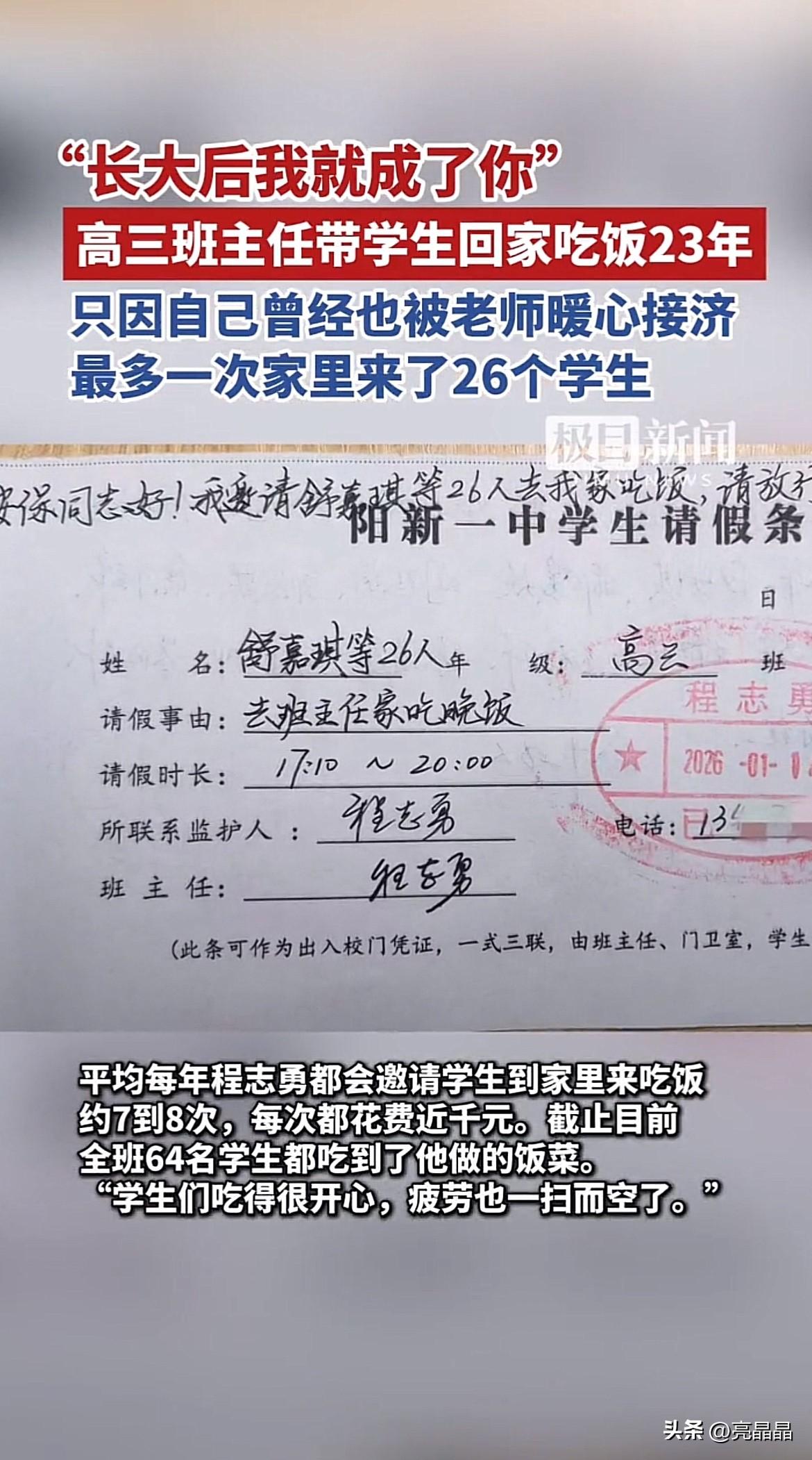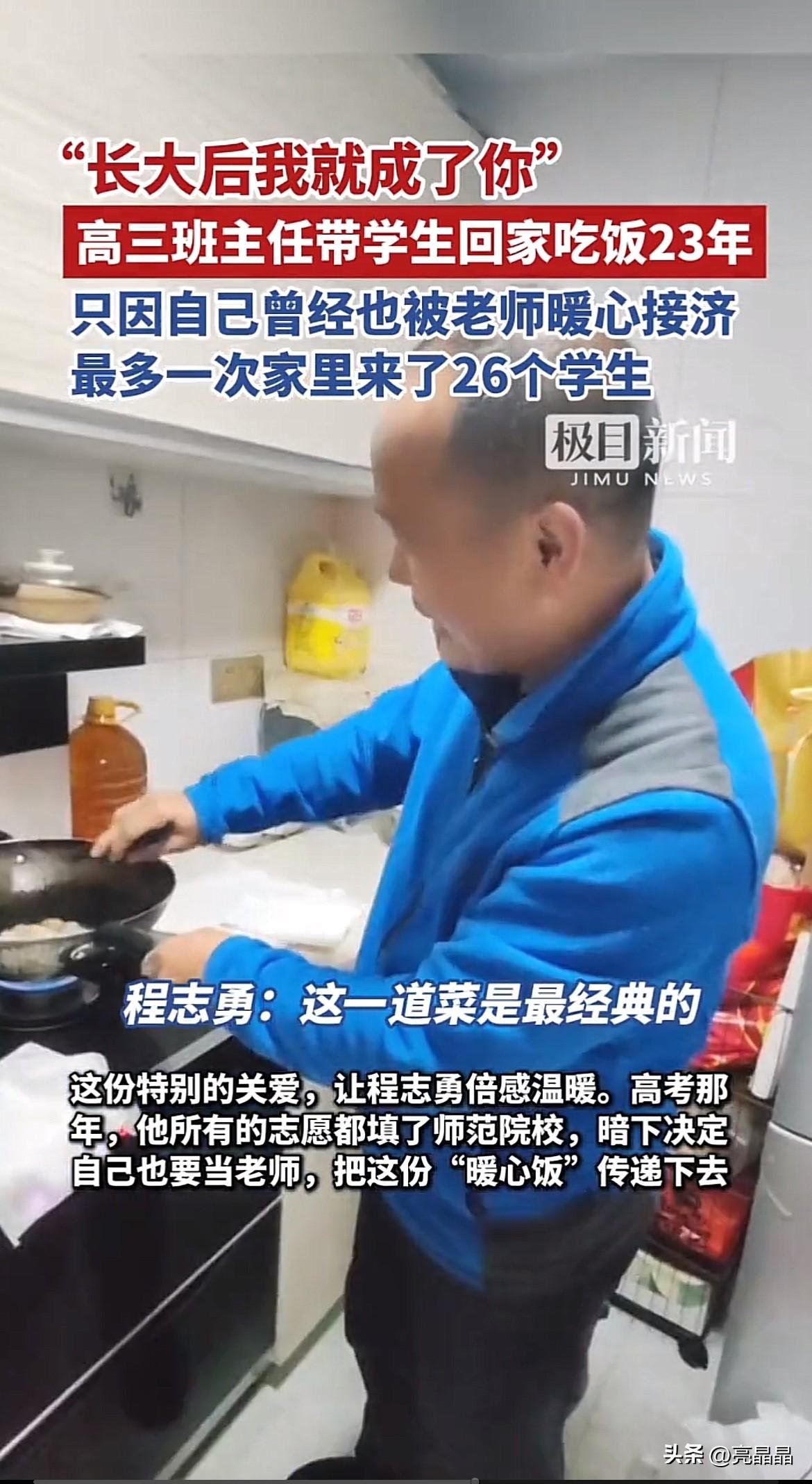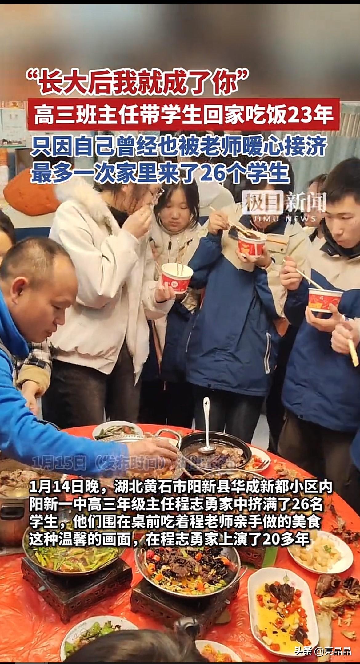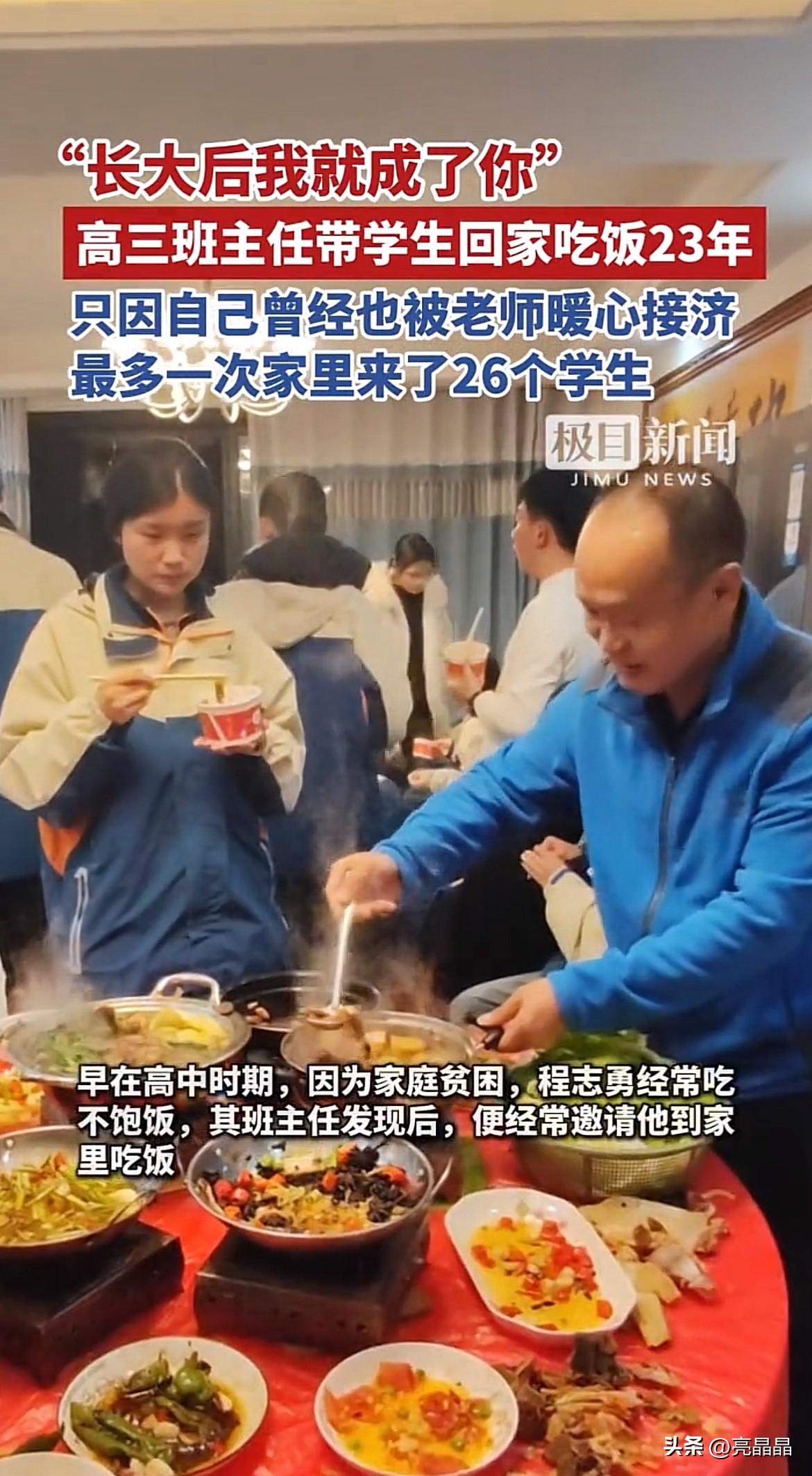 长大后成了你!湖北黄石,一高三班主任邀请班上26名学生到家吃饭,以此激励学习,学生们努力学习就为了吃上班主任亲手做的饭菜,班主任这一坚持就是23年。 班主任这么做,只因在他高中时期,家庭贫困,经常吃不饱,当年班主任发现后,就邀请他去家里吃饭,这件事激励了他,也让他立志当老师。 当他考上师范大学,毕业当了老师之后,就将这份特殊的暖心饭经历传递下来,邀请学生到家中吃饭,作为奖励学生学习进步的方式。 目前全部64名学生都吃过他做的饭,侧面也说明了他们都有进步,班主任的奖励餐起到了激励作用。 一位学生说:“我最喜欢班主任做的牛杂火锅,比饭店烧得都好,外面吃不到这味道。”这大概是对班主任厨艺最大的夸奖和认可。 这样爱的传递,让老师和学生之间相处更加融洽,教与学更加有趣又有效。学生的一次次登门吃饭,是对自己学习进步的骄傲,是老师对他的激励和鼓舞,也是师生情不断升温的见证。 不知这暖心饭是否也在这年复一年,众多学生心里也埋下一颗种子,待学成归来时,也像这位班主任一般,用爱灌溉学生,用心教学,将这份美好继续传递下去,让这份爱感染更多学生。