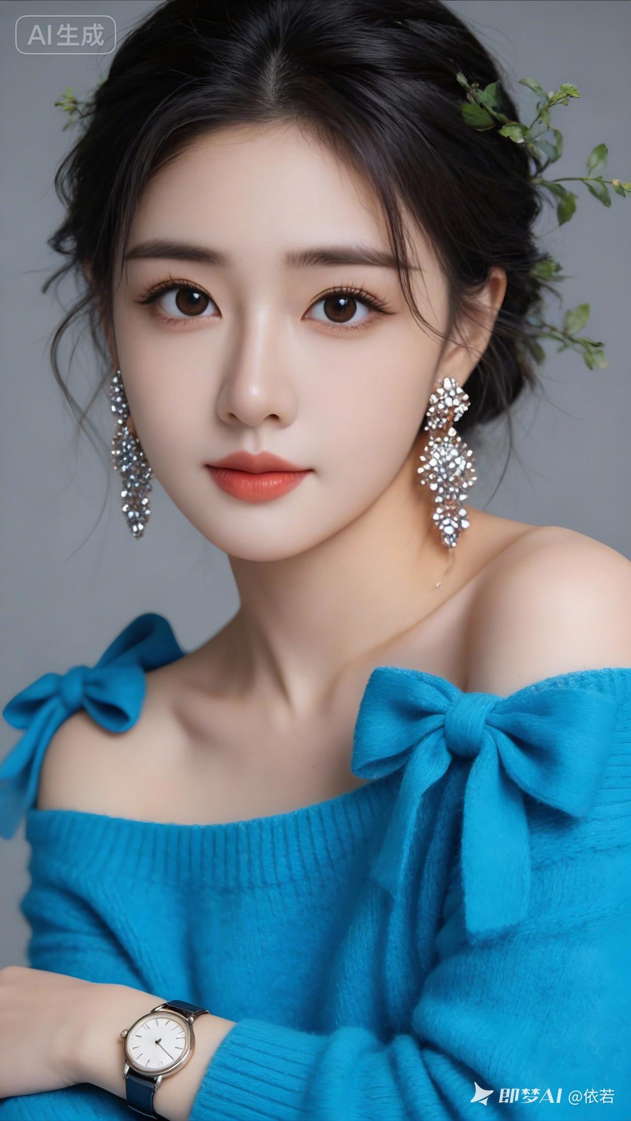 25岁年轻美女,森系发型衬得肤白貌美,宝石蓝露肩羊绒衫缀肩头蝴蝶结,搭手表显贵气,精致眼线睫毛配明艳红唇,气质脱俗亮眼。