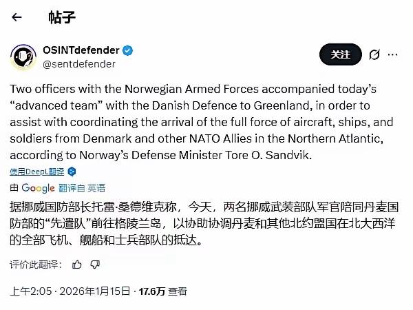 别这样搞笑!挪威出兵2人,英国出1人,保卫格陵兰岛 近日,欧洲多国相继公布出兵计划,帮助丹麦保卫格陵兰岛,以防特朗普夺岛。其中,德国出兵13人,法国派出15名山地战专家,挪威派出2人,英国只派出一名军官加入丹麦军队的侦察小组。 这是滑稽搞笑,还是无能为力?欧洲对俄罗斯一直张牙舞爪,好似时刻准备进入乌克兰,与俄罗斯大战一场,真正需要保卫格陵兰时,竟派出如此一支“大军”?应该是怕得罪特朗普,只能象征性的表演,同时也显示了欧洲的无能为力。