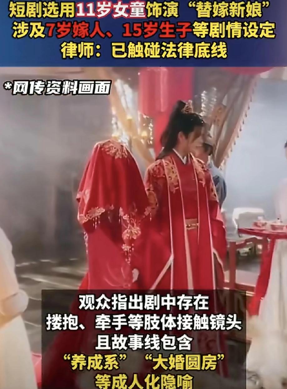 11岁女孩演“7岁嫁人15岁生子”?这剧终于下架了! 最近有部短剧可真够离谱的。 竟然让一个11岁的小女孩,去演一个“7岁被迫替嫁、15岁就当妈”的角色,剧情里还和成年男演员扮夫妻,有搂抱牵手的镜头。 很多网友都看不下去了: “古代有童养媳是事实,但不代表现在该拍出来给孩子演!” “这不就是变相诱导早恋、美化封建陋习吗?” “就算古代这样,也不值得歌颂啊!” 现在好了,多个平台已经搜不到这部短剧了,全部下架处理。 律师也出来说话了:剧情设定已经明显踩了法律红线,违反未成年人保护的相关规定。更严重的是,如果剧中亲密接触被认定超出表演需要,甚至可能涉嫌刑事犯罪。 拍剧要流量可以理解,但别把孩子的童年当噱头。 拿未成年人的纯真来炒作成人化剧情,迟早要凉。 支持严查! 短剧用童星演嫁人生子情节 未成年人表演边界在哪7岁嫁人15岁生子短剧引众怒童养媳 少女戏