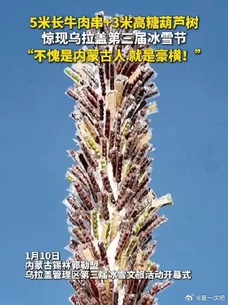 内蒙古现5米长牛肉串3米高糖葫芦树!5米长牛肉串3米高糖葫芦树惊现内蒙古 1月10日,锡林郭勒盟乌拉盖管理区第三届冰雪文旅活动开幕,现场惊现5米长牛肉串和3米高糖葫芦树,硬核美食搭配冰雪盛宴,把草原的热情和豪气拉满,这才是内蒙古冰雪节的正确打开方式。