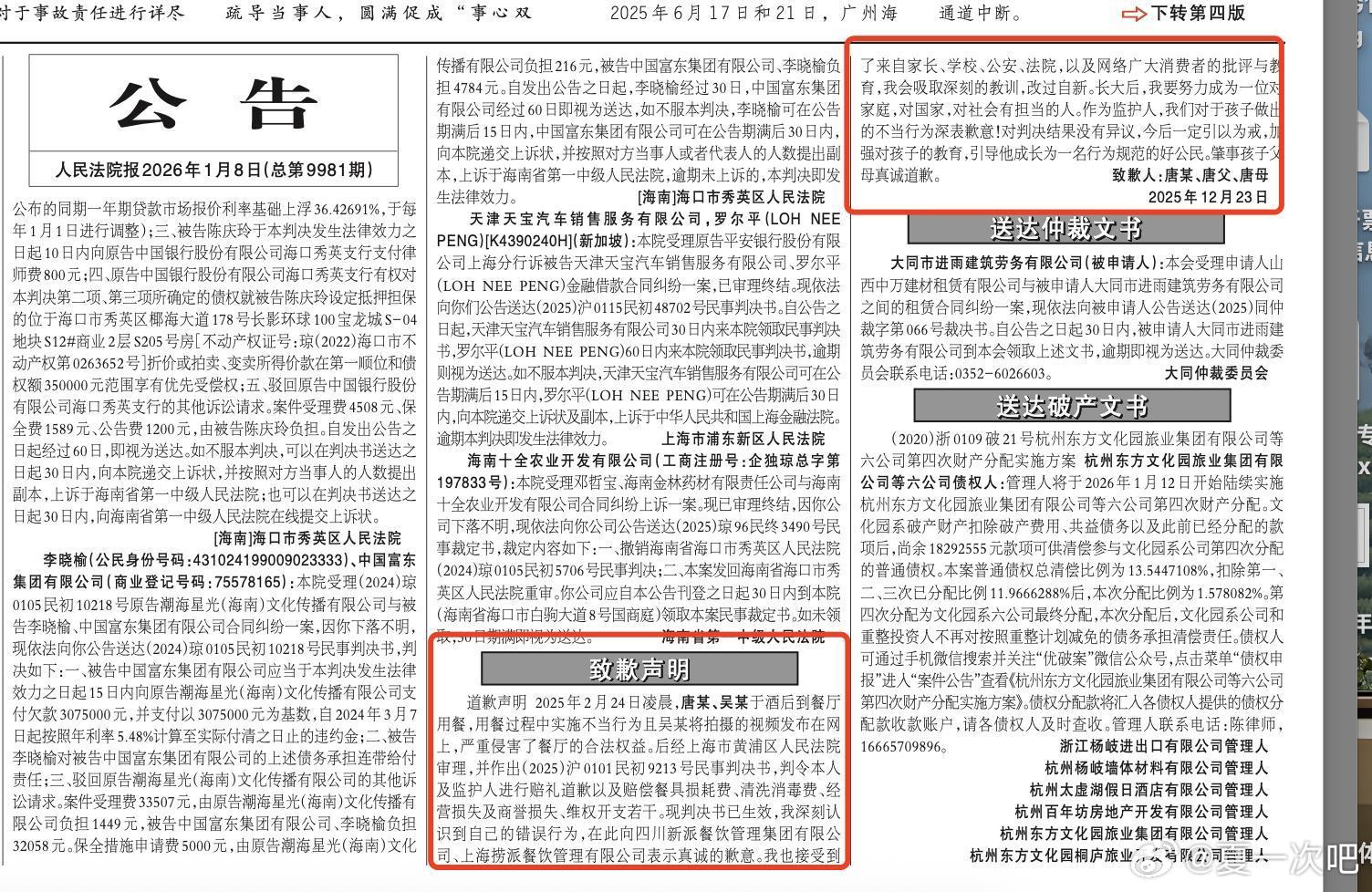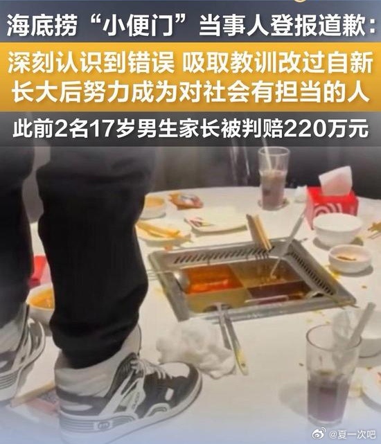 海底捞小便当事人登报道歉!海底捞小便事件 1月8日,法院刊登海底捞小便当事人及其父母道歉声明。当事人唐某表示:我深刻认识到自己的错误行为,在此向四川新派餐饮管理集团有限公司、上海捞派餐饮管理有限公司表示真诚的歉意。