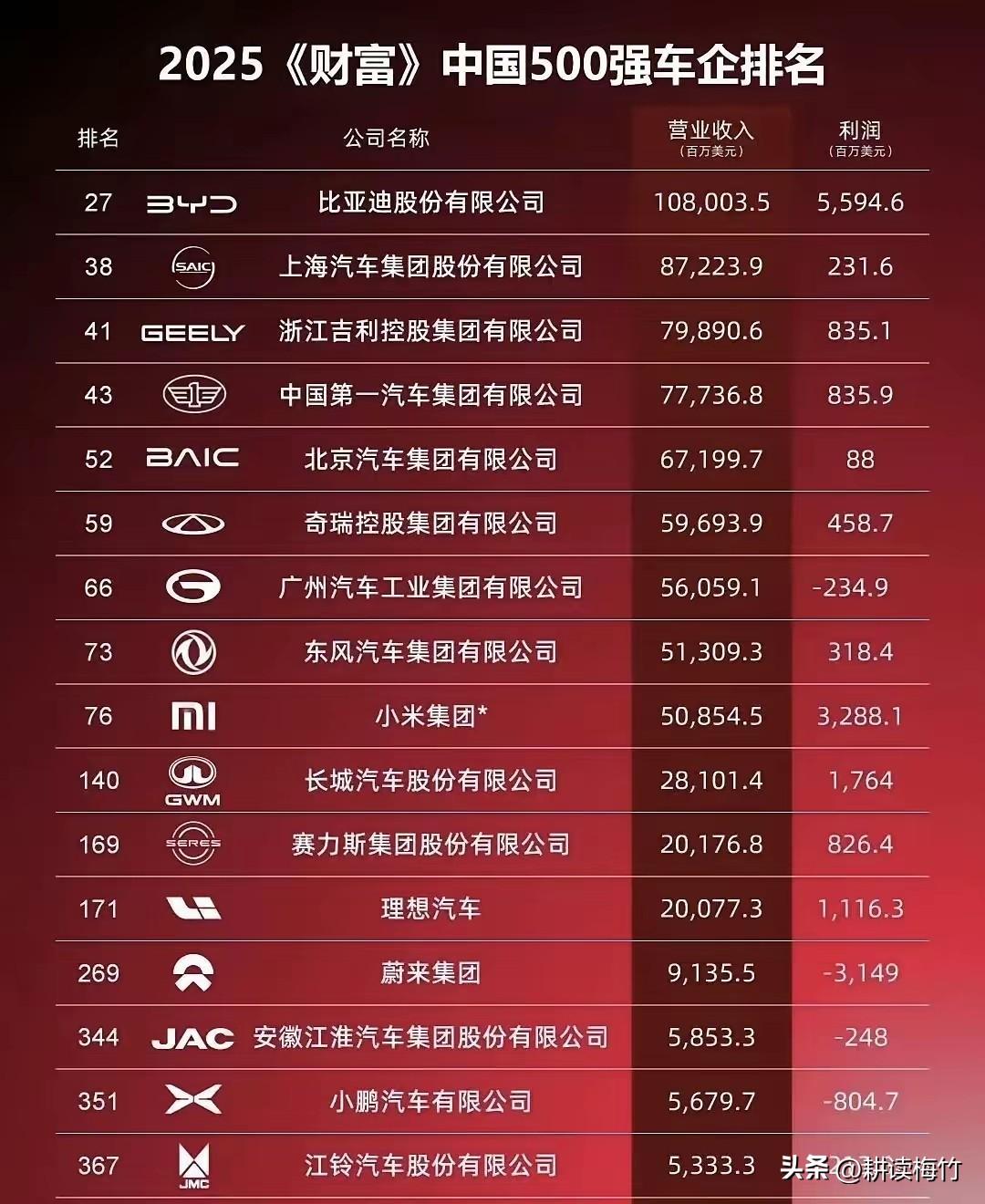 比亚迪无悬念夺冠!2025年财富中国500强车企排名出炉! 扫了一眼这榜单,基本与印象里的情况符合,主流车企都在榜单内,不管是老牌车企一汽、东风还是新势力蔚小理,可是为什么没有长安在里面呢,这榜单是不是还是有问题? 长安今年销量都接近300万台了,不可能营收还没有小鹏、江铃这些车企吧,怎么把长安漏掉了呢? 另外从营收和利润对比来看,小米的利润是真高啊,理想、赛力斯也不错,因此有时候不能仅仅看销量,健康的财务状况也很重要。