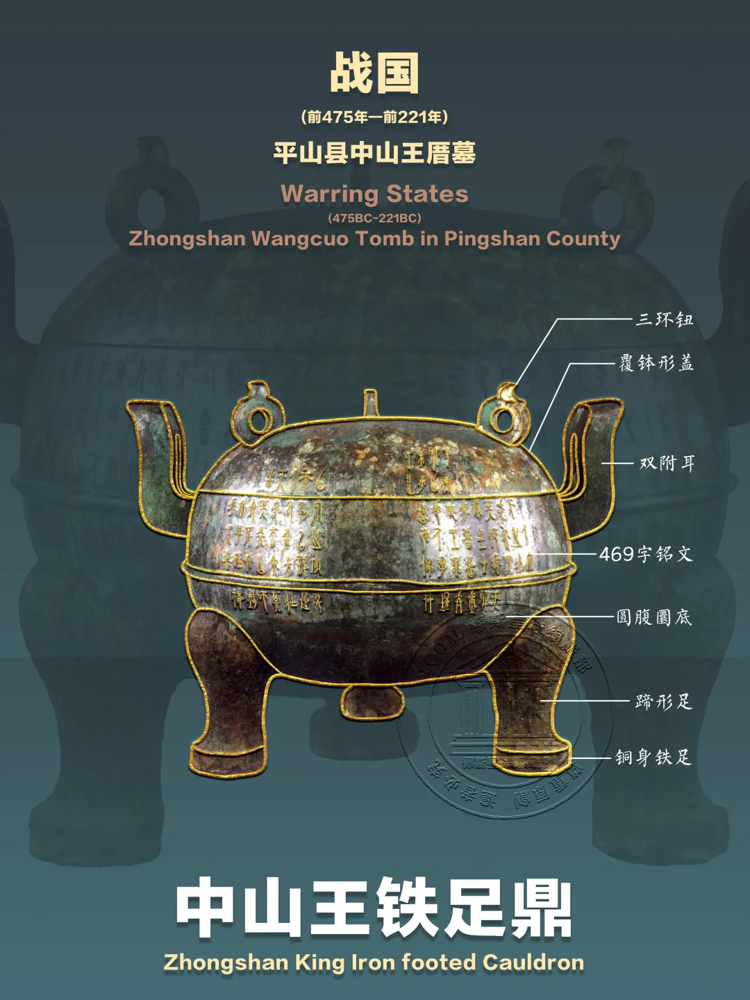 📍1977年,它从平山县中山王厝墓中苏醒,以469字的铭文刻满周身,成为战国青铜器中铭文字数之最。