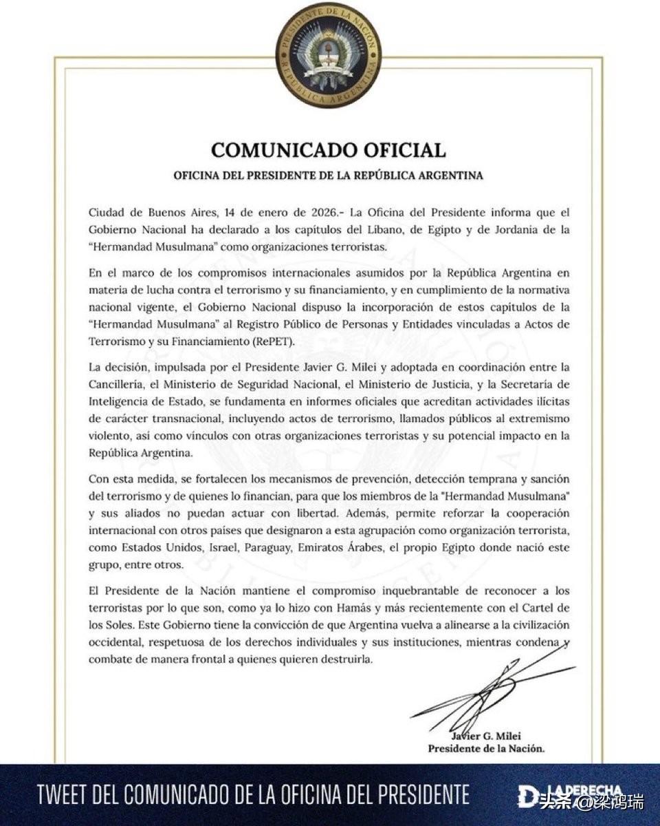 2026年1月14日,阿根廷共和国总统办公室宣布“穆斯林兄弟会”在黎巴嫩、埃及和约旦的章节为恐怖组织,并将其纳入阿根廷《与恐怖主义行为及其融资相关人员和实体公共登记册》(RePET)。 该决定是基于官方报告,这些报告证明了这些分支机构从事跨国非法活动,包括恐怖主义行为、公开呼吁暴力极端主义,以及与其他恐怖组织的联系。 此举旨在加强预防、早期发现和惩罚恐怖主义的机制,并加强与美国、以色列、巴拉圭、阿联酋和埃及等已将该组织指定为恐怖组织的国家/地区的国际合作。 总统哈维尔·米莱重申其坚定不移的承诺,即承认恐怖分子并与之战斗,就像他之前对待哈马斯和“太阳卡特尔”一样。 该决定旨在使阿根廷重新与尊重个人权利和制度的西方文明保持一致.