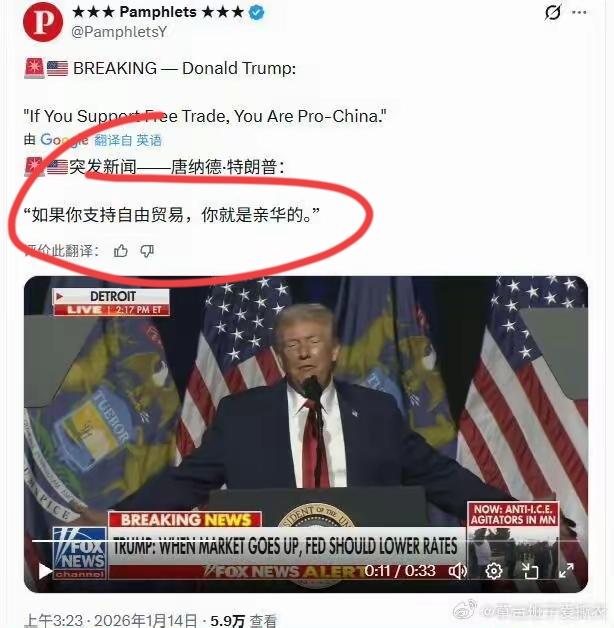 1月14日,白宫用一张“哪边,格陵兰岛人?”的漫画完美复制了特朗普“我不拿下格陵兰岛,中国和俄罗斯就会拿下”,这种把自己霸占格陵兰岛的恶念强行分给中俄一部分,以稀释芬兰、欧洲、乃至全世界对其强盗行径指责的伎俩。特朗普能把美国的“强盗文化”上升到如此“强盗文明”的程度,只有强盗当久了的强盗中的强盗才能做到吧?美国不但非常自然地做到了,而且还分中俄一份,这就是特朗普说的,他跟俄罗斯、中国的“关系非常良好”的真相。有点讽刺。 不止是对格陵兰岛人,特朗普还给了全世界一个同样的选择题(图2),也是1月14日,他写道:“如果你支持自由贸易,你就是亲华的。”言外之意就是谁支持自由贸易,就是反美的,他这是在胁迫全球在自由贸易与美国优先中做选择。如果把中俄拉进来还稍显“文明”,那胁迫全球在中国和美国之间做二选一,则是又控制不住的恢复了强盗的嘴脸。 欲亡必狂,谁都一样,已经天怒人怨,美国已在路上。